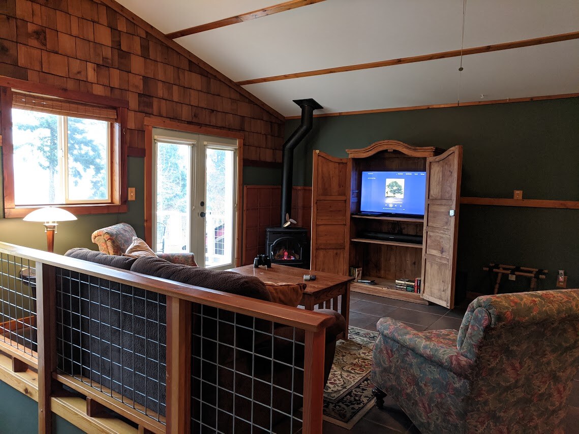 Waterfront Cottage (sleeps 4) has a separate bedroom with a queen size bed, queen sofa bed the living room. Bedroom and living room are separated by a door and wood blinds. Sliding glass doors open up to a private deck. Wood floors, duvet covers, kitchenette, Smart TV. 3 night min, but we occasional accept shorter stays, pls ask. Owner built and managed. Not run by an anonymous management company.