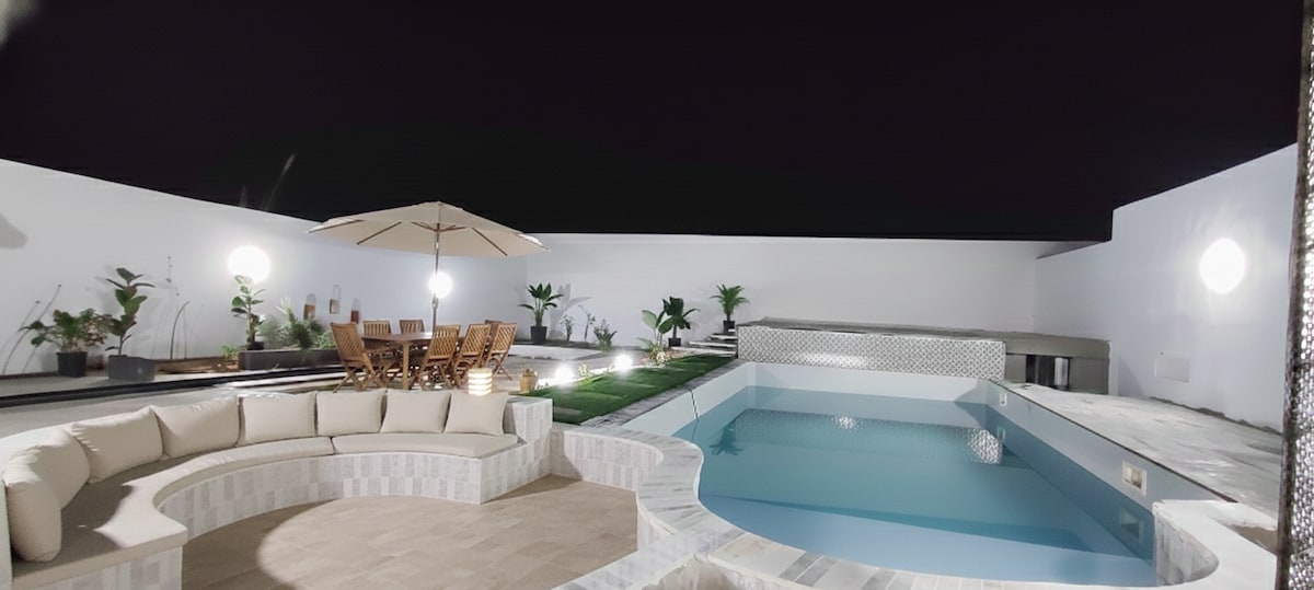 Bienvenue à DAR DIJA, Nichée au cœur d’un verger d’orangers, en pleine campagne mais à quelques minutes de la ville , DAR DIJA offre une parenthèse de tranquillité sans s’éloigner de la ville. La maison propose 3 superbes suites, un salon convivial avec cheminée, une cuisine entièrement équipée, ainsi que 2 studios entièrement équipés, DAR DIJA accueille confortablement jusqu’à 12 personnes, idéale pour un week-end détente Plusieurs services sont proposés sur demande : cuisine, ménage
