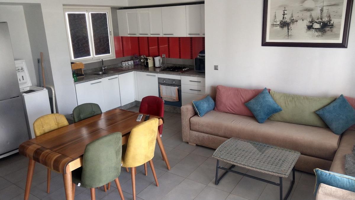 Super air-conditioned apartment in a private residence with swimming pool, security and free parking. The apartment has two facades, is bright and spacious facing the sea, and is composed of two bedrooms, 2 living rooms, 2 bathrooms, 2 balconies and located on the 1st floor. The large balcony equipped with table and chairs, with an unobstructed view of the garden and with a moderate view of the pool and a balcony with a table overlooking the garden. The apartment is located around Marjane Market and Golf, aqua park and 2 minutes from the beach