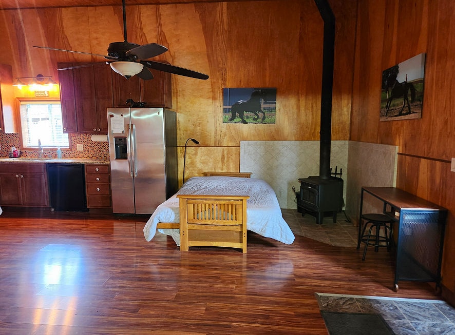 Exactly 9.6 miles from Peoria airport and exactly 14.6 miles to the Peoria Civic Center, this apartment is located in a quiet country area. This is an apartment in the Horsemeister stall barn. Private entrance, plenty of parking, This is a working horse farm with 2 stallions, mares and foals. Can sleep 4 adults comfortably but if you have a larger group you are welcome to bring airbeds. This is just 4 miles from the village of Hanna City. There is a sectional couch that can sleep 2 children.