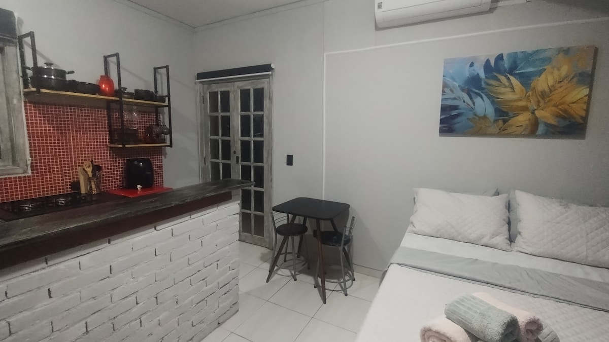 Studio/Kitnet apartment, with a double bed, private bathroom and kitchen, maximum capacity for two people. We offer bed and bath linens, as well as a full kitchen (we do not serve meals). We have a privileged location, three blocks from Enseada Beach in Bertioga, close to services (market, bakery, restaurants, etc.). Do everything on foot!