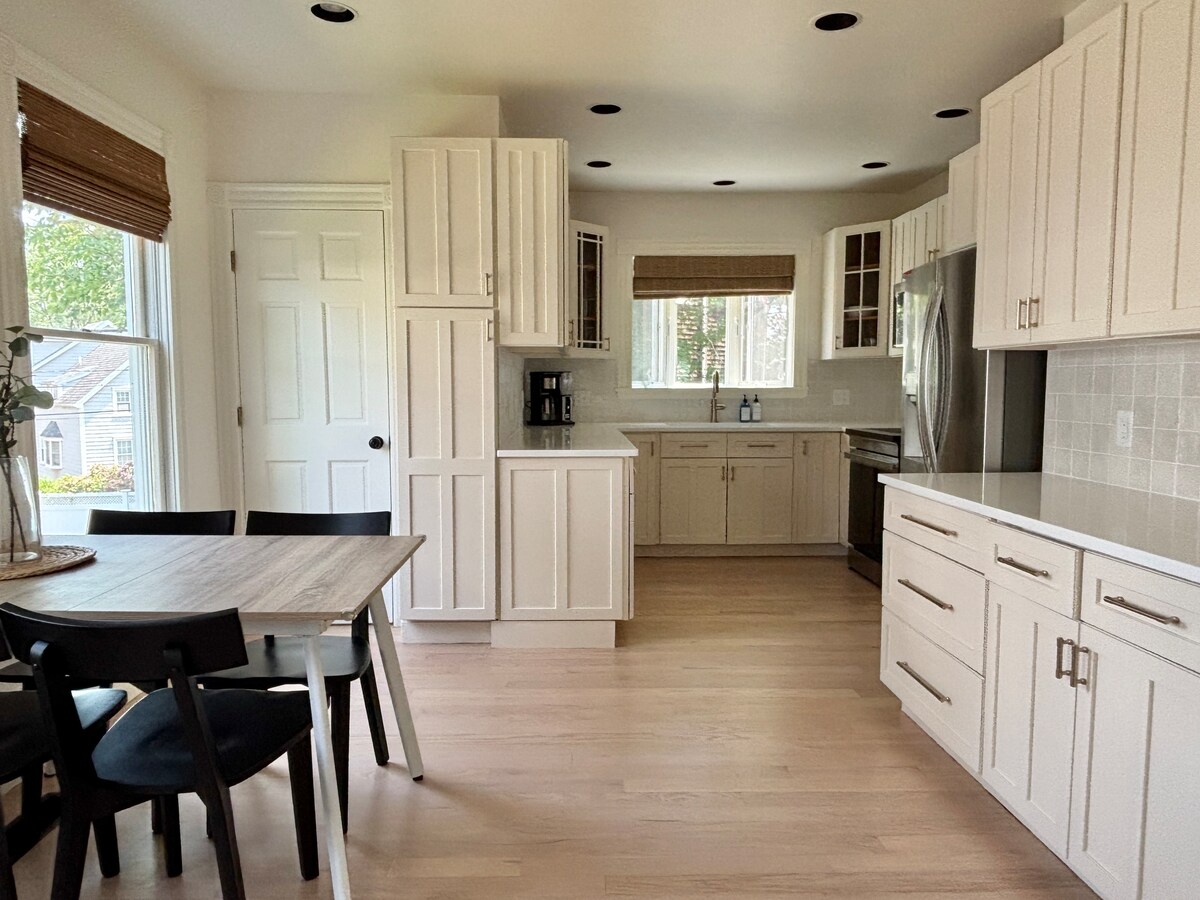 Large kitchen (w/s.s. appliances & all the amenities), sun room, dining room, flat screen smart TVs in the living room & finished basement, high speed wi-fi (1gig) & laundry. Lots of windows make it bright. French doors open to a 16x16 deck leading to large fenced in yard. House is good for couples, business travelers, families, friends and pets. Close to downtown, train is a 5 minute walk away, highways, Lake Quannapowitt, Breakheart, 9 miles to Encore Casino & <15 miles to Boston & Salem.