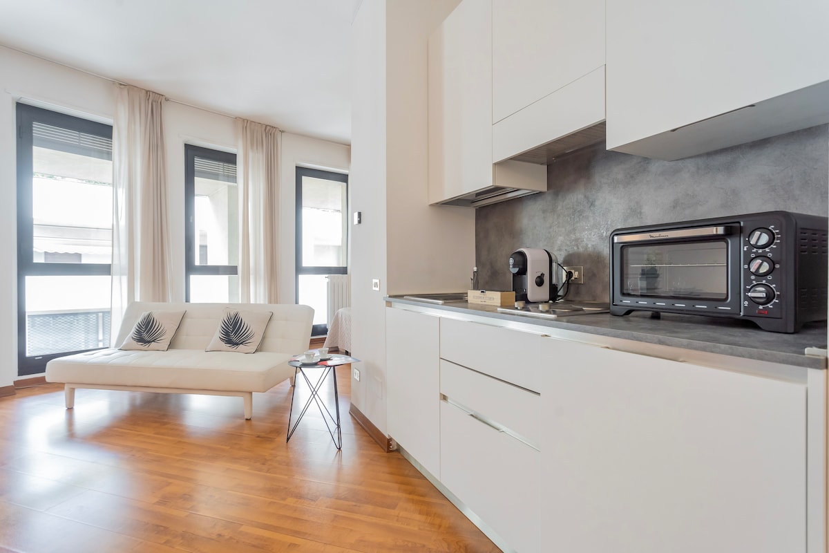 The Molini Residence is an elegant apartment in the heart of Monza! Just a short walk from the Cathedral and the city's main attractions, the apartment consists of a spacious and bright living room with a fully equipped open kitchen, a double bedroom with a large walk-in closet, and a windowed bathroom with a large shower cubicle. Fully experience Monza, immersed in Italian culture and beauty. The area is well-served and abundant with both free and paid parking.