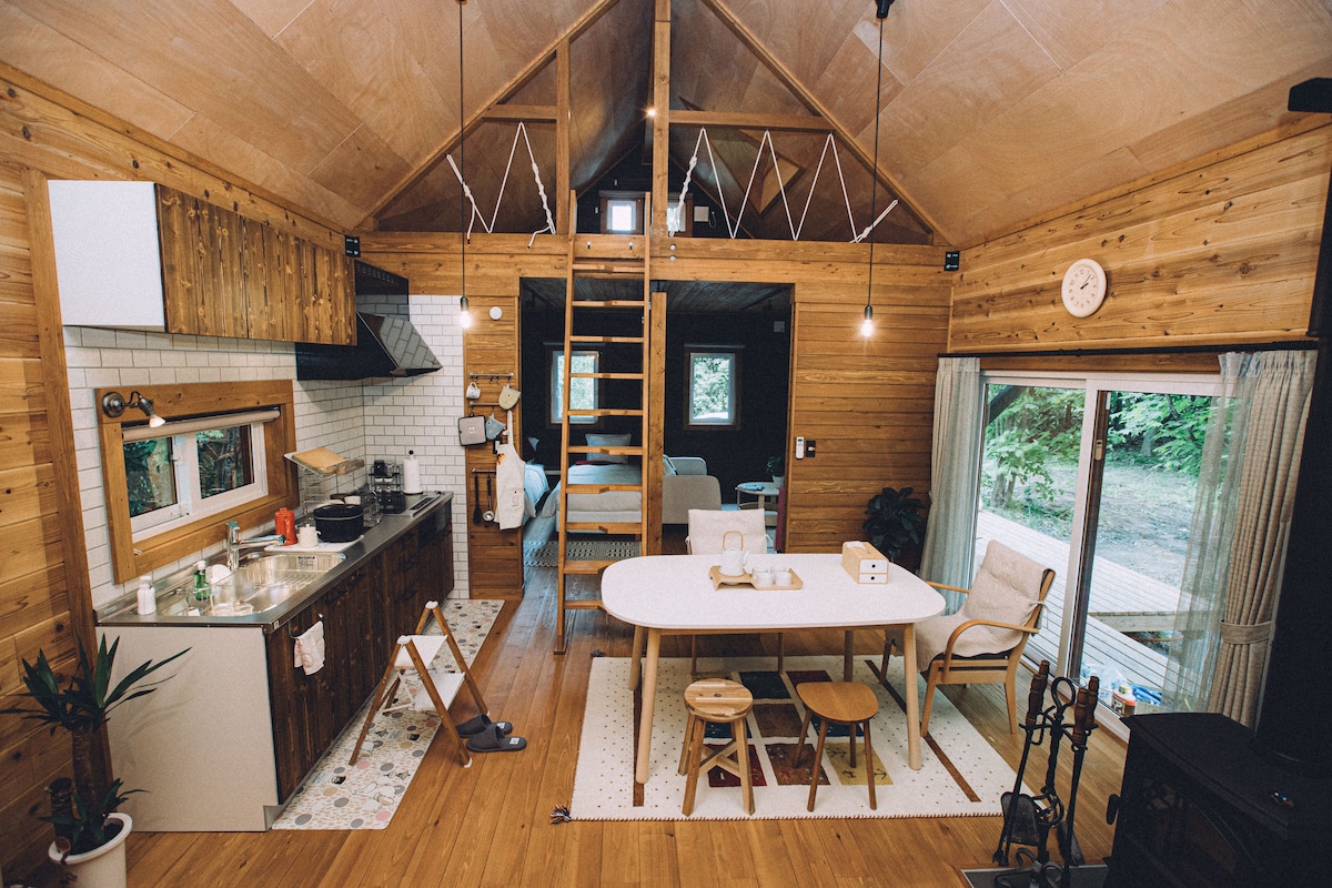 【1】最大2人 × パノラマウインドウから眺める絶景 果てしなく広がる田園、静かな自然に囲まれた環境。清らかな空気と澄み切った空の下で、四季折々の絶景が日常の喧騒から離れ、心身の疲れを癒してくれます。 最大2人まで宿泊可能。大切な人との心の交流の旅、または一人旅にも大人旅に最適です。春には桜のピンクを愛で、夏は蝉の鳴き声に耳を傾け、秋は紅葉に染まる道を散策し、冬は暖かいココアを飲みながらパノラマウインドウから雪化粧したガーデンを眺める。 大自然の中で普段都会では見ることが少ない、様々な虫や動物たちを見ることができるかもしれません! 一人でも二人でも、心の疲れを癒し、特別な体験ができる空間です。 【2】1Kの一棟貸切 × 心温まるデザイン 淡い色調と木材を活かしたインテリア、シーリングファンなどのデザイン性の高い設備。エアコンや暖房完備で、夏も冬も快適に過ごせます。 Airbnbでは珍しい1K戸建て。目覚めた時に広がる田園の美しい景色が、素晴らしい一日の始まりを約束します。 大きな自然を感じながら大人な空間をお楽しみください。