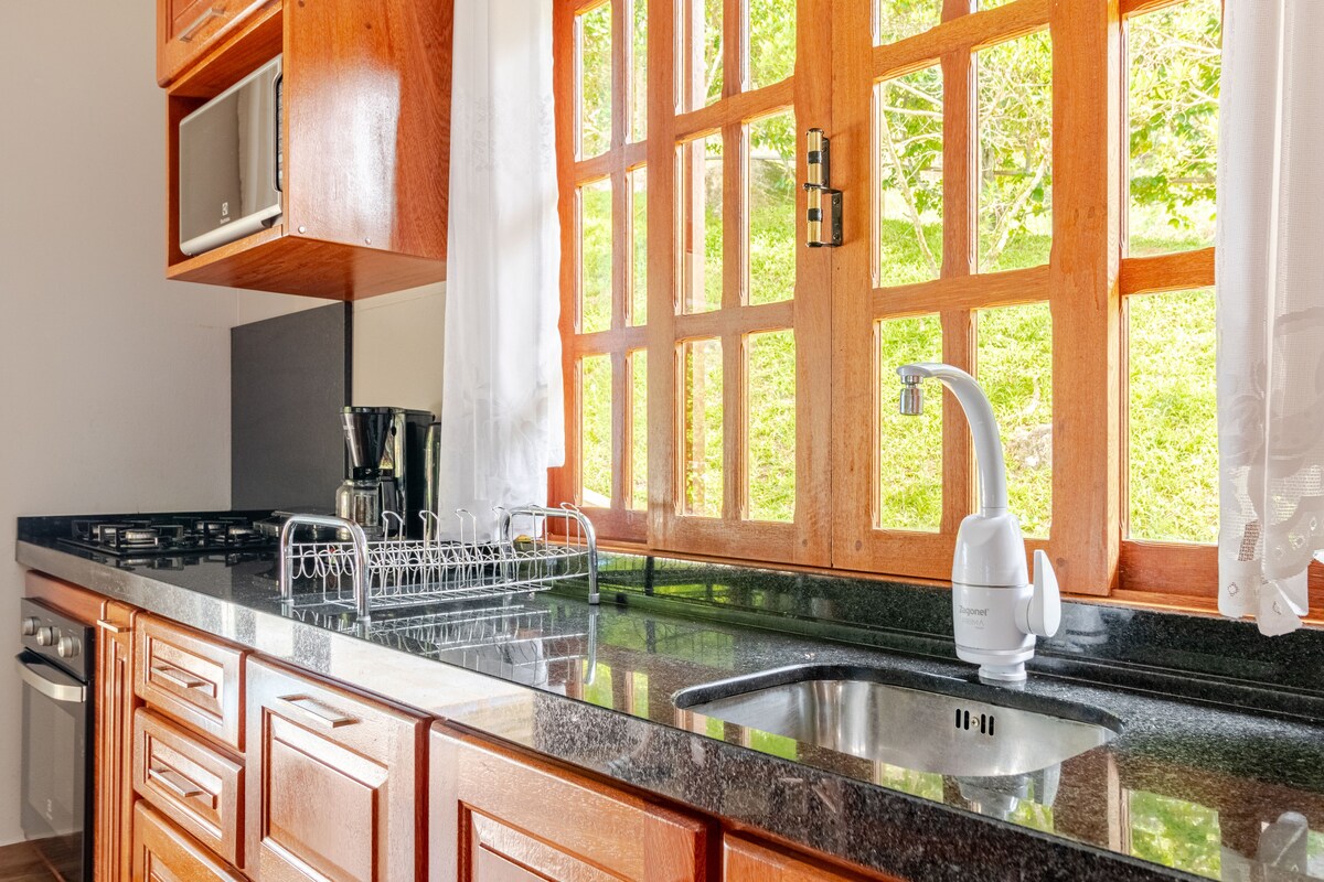 Spacious country house with 3 en-suites (two with queen-size beds and one with a double bed), full kitchen and living room with 55" TV. Air-conditioned rooms with a balcony. 20 minutes from downtown, the place offers peace and quiet, surrounded by nature. Relax to the sound of the private waterfalls on the property, where you can bathe. Enjoy the pool, deck with barbecue and the vegetable garden available. Covered garage for two cars and large courtyard for more cars. Approx. 1:30h from beaches. Ideal for families