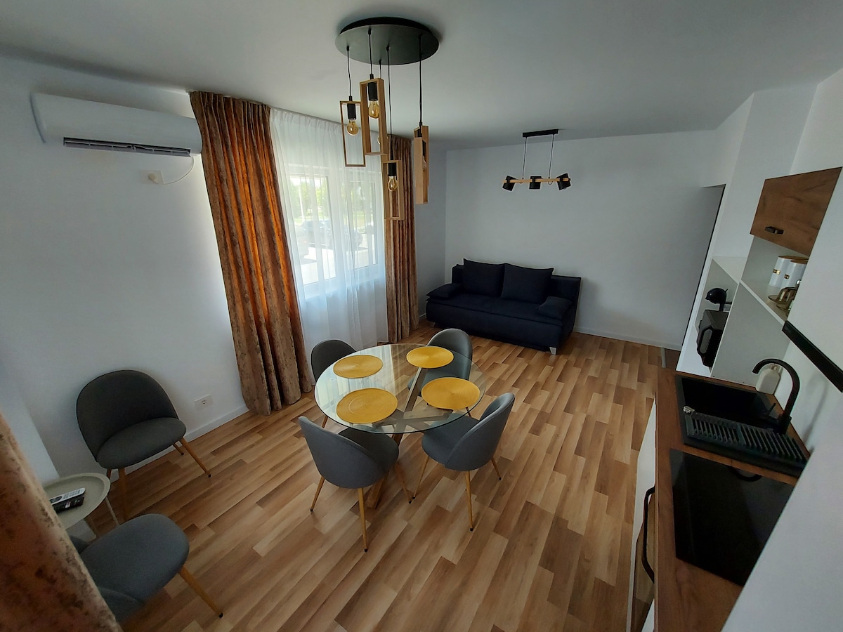 Modern apartment, 1st floor, close to the center of Oradea (0.7 km), near Ramada, Airport, Lotus Mall 2. Completely renovated, it offers free WiFi, air conditioning, Smart TV in each room, balcony for smokers. It has a spacious living room, equipped kitchen, bathroom with shower, toilet, 2 bedrooms (double bed & sofa bed). Ideal for families, friends or business. Max. capacity: 5 pers. Close to shops, transportation & attractions. No parties/animals!