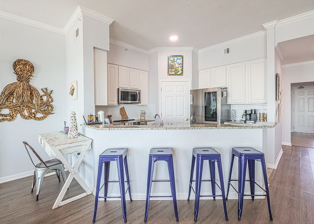 Relax and unwind in this cozy, chic and very welcoming space. This unit has been completely renovated and upgraded with modern luxurious touches all to help make your stay most comfortable. This unit also faces south with a slight beach view and sea breeze. Unit is top floor (stairs) and backs up to the mailboxes, when the blinds are open, beautiful trees are the view! 50 inch smart TV, equipped with Amazon Firestick, quartz countertops, 5G Wifi and normal wifi available