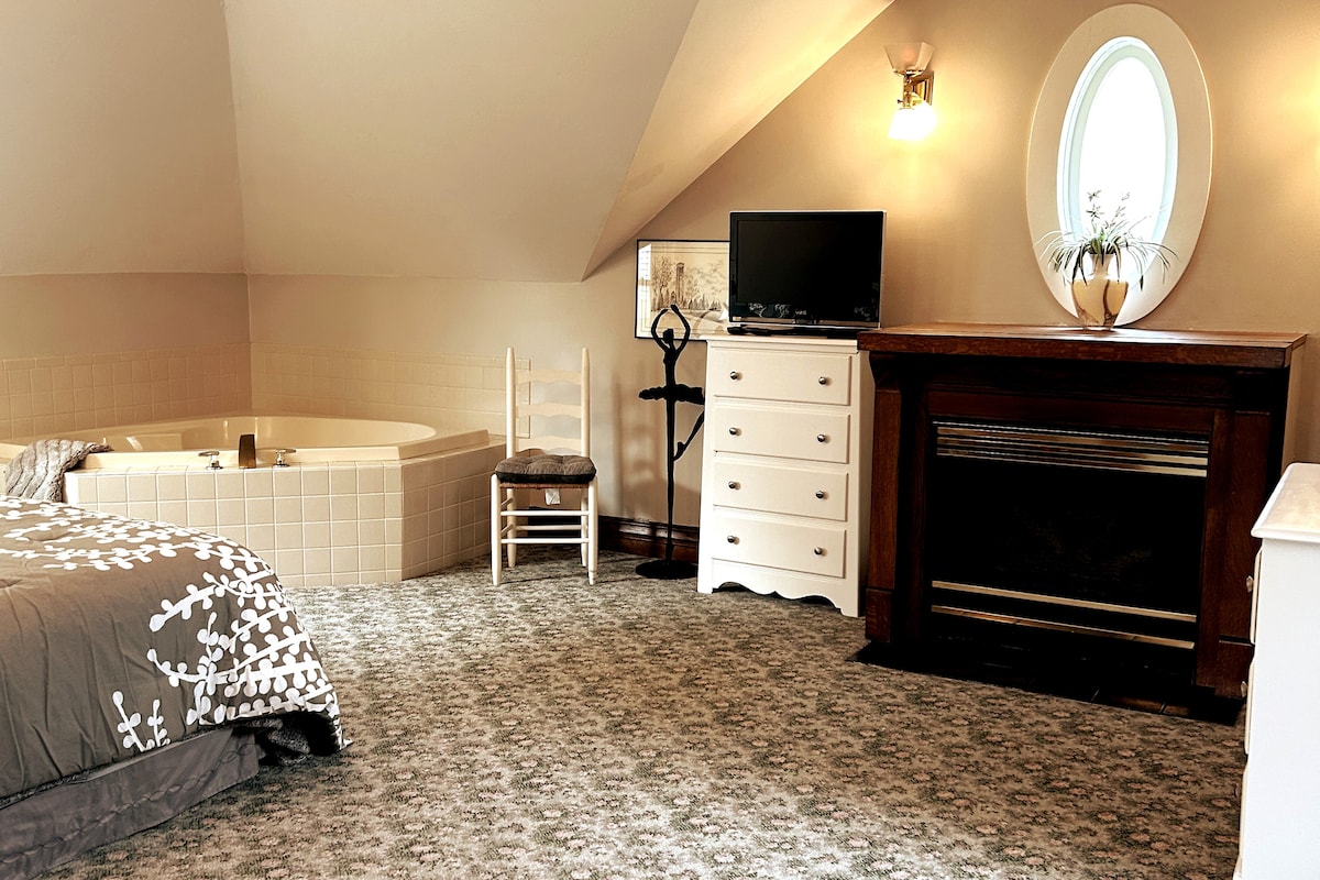 Tucked away near a beautifully wooded nature reserve is the perfect getaway. The beautiful spacious carriage house apartment/suite with gas fireplace, double whirlpool and gas style lighting awaits you! Crafted for comfort. It is ideal for couples seeking genuine connection, celebrating first anniversaries or golden milestones. It provides a cozy escape for those craving solitude to unplug, recharge and renew or a peaceful place to sleep while visiting family or friends.