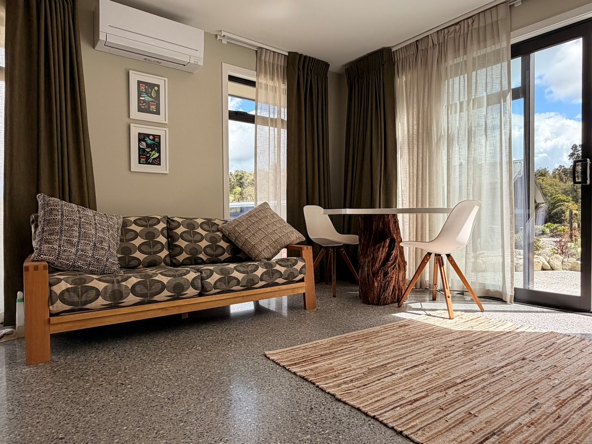 Take it easy at this unique and tranquil getaway. Spectacular elevated views will greet you on arrival, inviting you into our piece of paradise. This one-bedroom luxury getaway is a private, warm, and relaxing place to unwind. Surrounded by native bush and oceanic views over the Tasman, it's a perfect getaway to absorb the beauty of the West Coast and everything it has to offer. The stunning coast road is right at your doorstep and is regarded as one of the top 10 drives in the world.