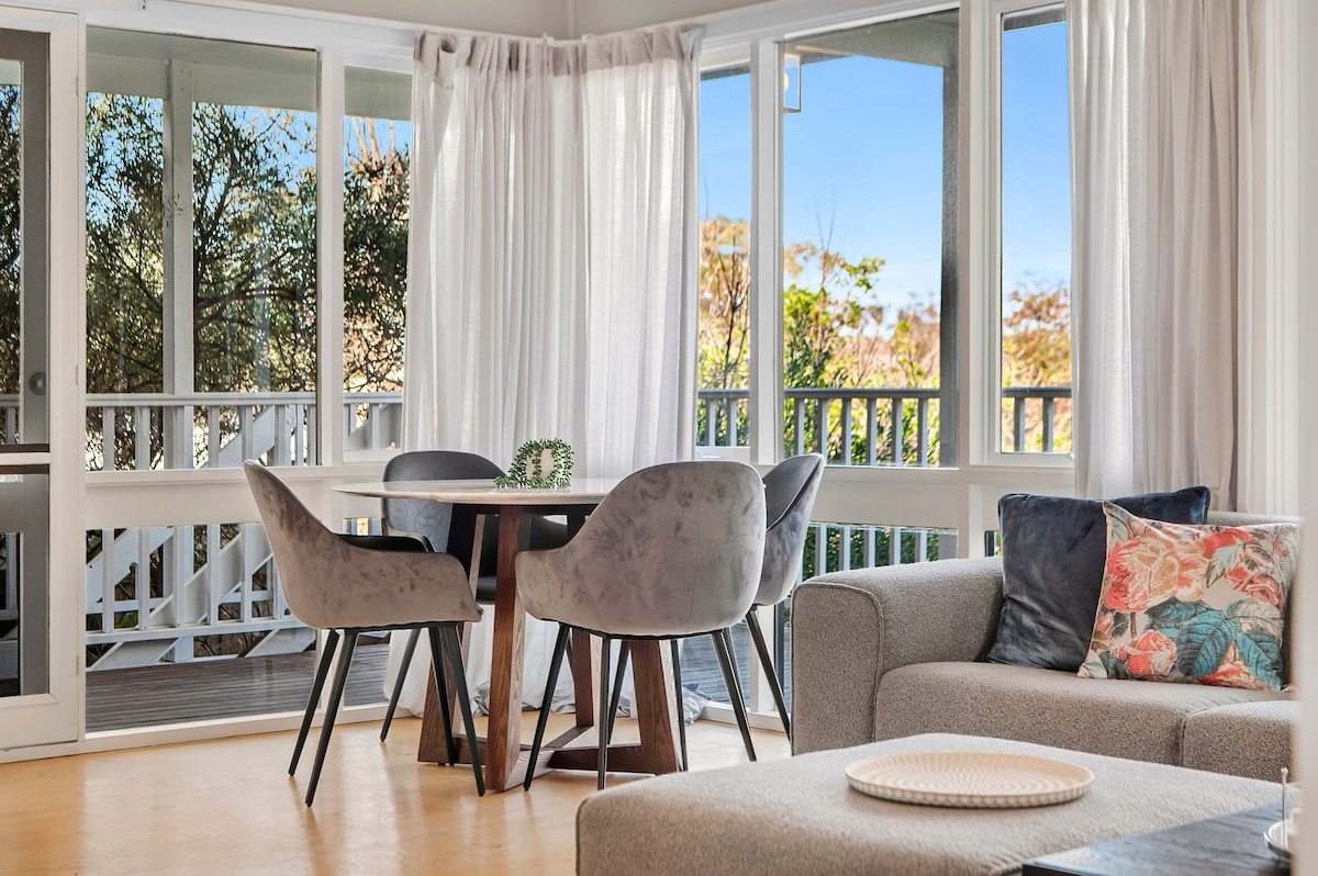 Perfect for couples! Enjoy a romantic getaway in the comfort of this gorgeous indoor-outdoor living space with uninterrupted views & sliding doors open to enjoy the sea breeze. The private deck is perfect for that quiet morning coffee. Unwind while taking in the stunning 'Sunset Views'. We offer Netflix & wifi. Linen & bath towels. 5 minute drive to Peninsula hot springs, Alba. beach's & shops! Access to the cottage is via stairs, we provide one park. Sea Store cafe 5 minutes walk away.