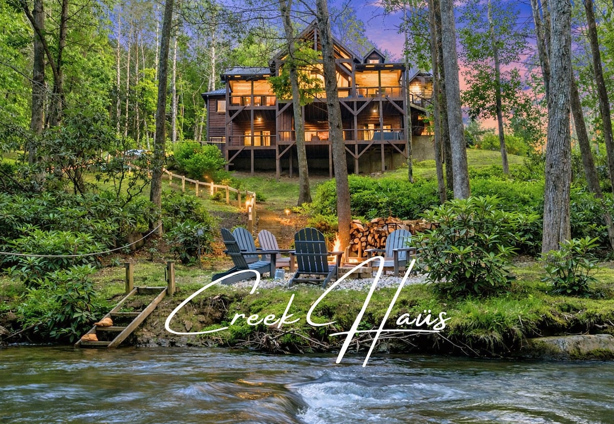 Welcome to The Creek Haüs, a luxury mountain cabin in Blue Ridge designed for connection, comfort, and unforgettable stays. This stunning 6-bedroom retreat features multiple entertainment spaces, a movie lounge, game room, two kitchens, a hot-tub retreat, fire-pit, and direct creek access for floating and relaxing. Under 15 minutes from downtown, perfect for elevated group getaways, wellness escapes, and memory-making in the mountains.