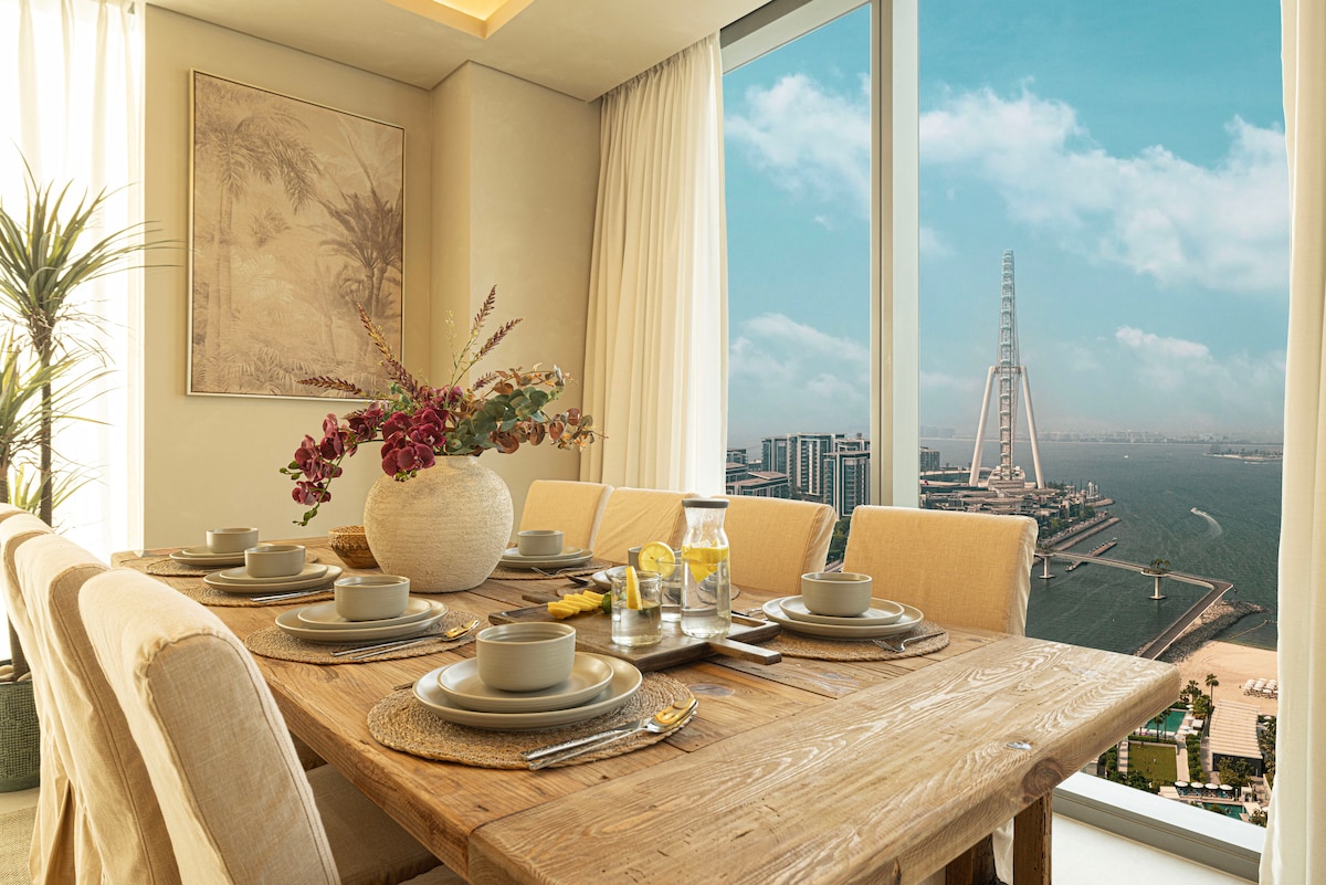 With breathtaking Dubai Eye, Palm Jumeirah and sea views, this lovely two-bedroom apartment features a luxury experience located in Jumeirah Beach Residence (JBR)- Rimal 6 Building. The Apartment is fully renovated, upgraded and all the furniture is brand new, just steps to the Beach. From both bedrooms and the balcony guests can enjoy their morning coffee while admiring views. The dining table seats six comfortably. The kitchen comes with all the necessary appliances. Welcome to Dubai