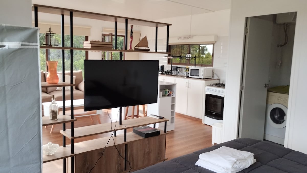 Casitas_del_ensueno: Cabaña a 50m. de la playa en medio de bosque nativo. Construida con materiales cálidos y de diseño, aberturas doble vidrio, estufa a leña, AC frio/calor, calefactores en los cuartos. Amplio espacio abierto living-cocina con todo para 4 huéspedes (max. 3 adultos), 1 dormitorio en suite con salida al deck, 2do dormitorio con cama nido (twin) y 2do baño. Wifi por FibraOptica. Pura luz y bosque a un paso del río. Estacionamiento 2 autos, parrillero, TV, hamaca, sillas de playa.