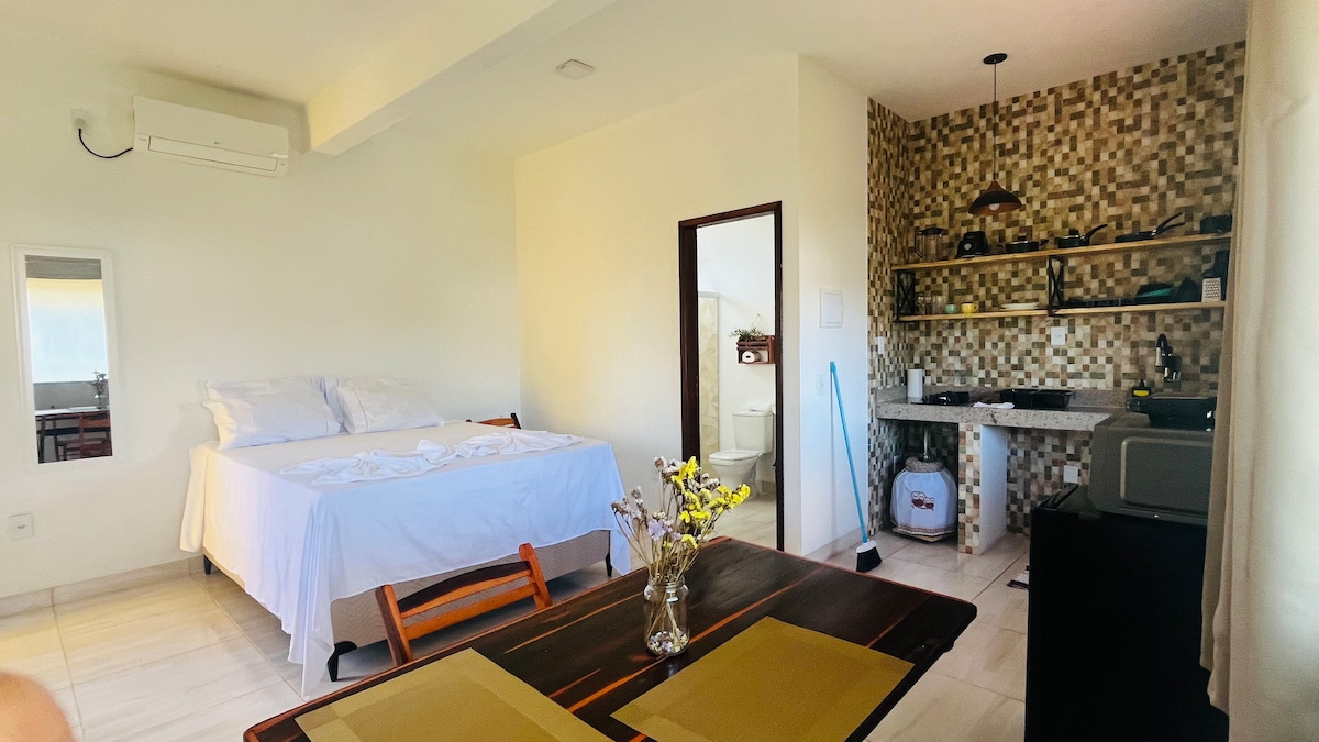 Read the listing before closing. The home is on the 1st floor. Studio apartment with air conditioning for couples, featuring a tall and comfortable Ortobom queen bed. The cleaning fee includes bed and bath linens, and a new fee will be charged to change them. We offer basic household utensils, plates, cups, cutlery, microwave, minibar, sandwich maker, blender. 🚧 We are building more accommodations in the same area as the houses, the work takes place from Monday to Friday from 7 a.m. to 6 p.m., delivery 12/25