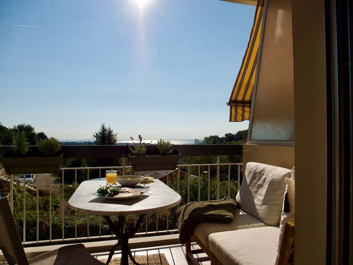 Panoramic sea view (Cap d'Antibes) Studio with balcony in the center of the village of Tourrettes sur loup. Very bright. The accommodation is not equipped for meal preparation. Check-in is available from 5pm to 8pm. Check-out 10AM.