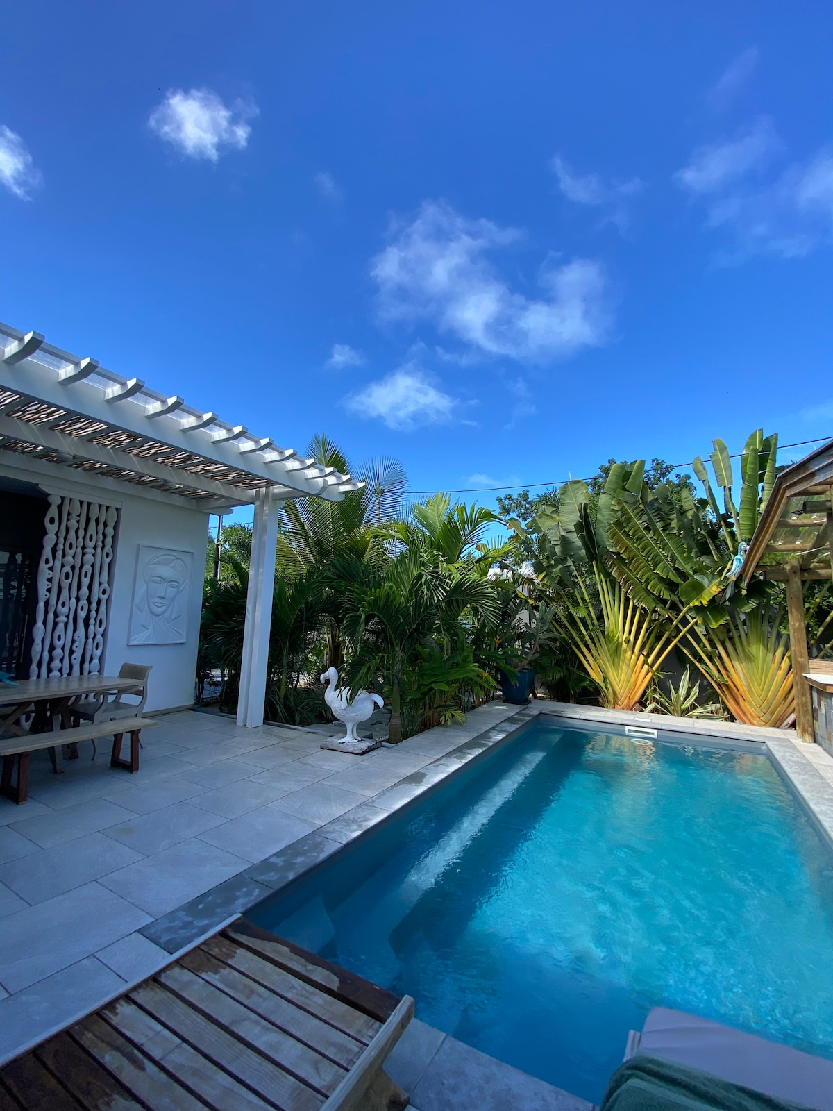 8 minutes from the airport (ideal for departures/arrivals) Our space is originally designed and offers a cosy atmosphere. It is an invitation to cocooning. Facing the lagoon, with extraordinary views of the sea, the sunrise for those who wake up early and also the public beach, this stunning Villa will accommodate up to 6 people in its 3 bedrooms, and its private pool. While remaining calm to discover the charms of Mauritius and also to relax.