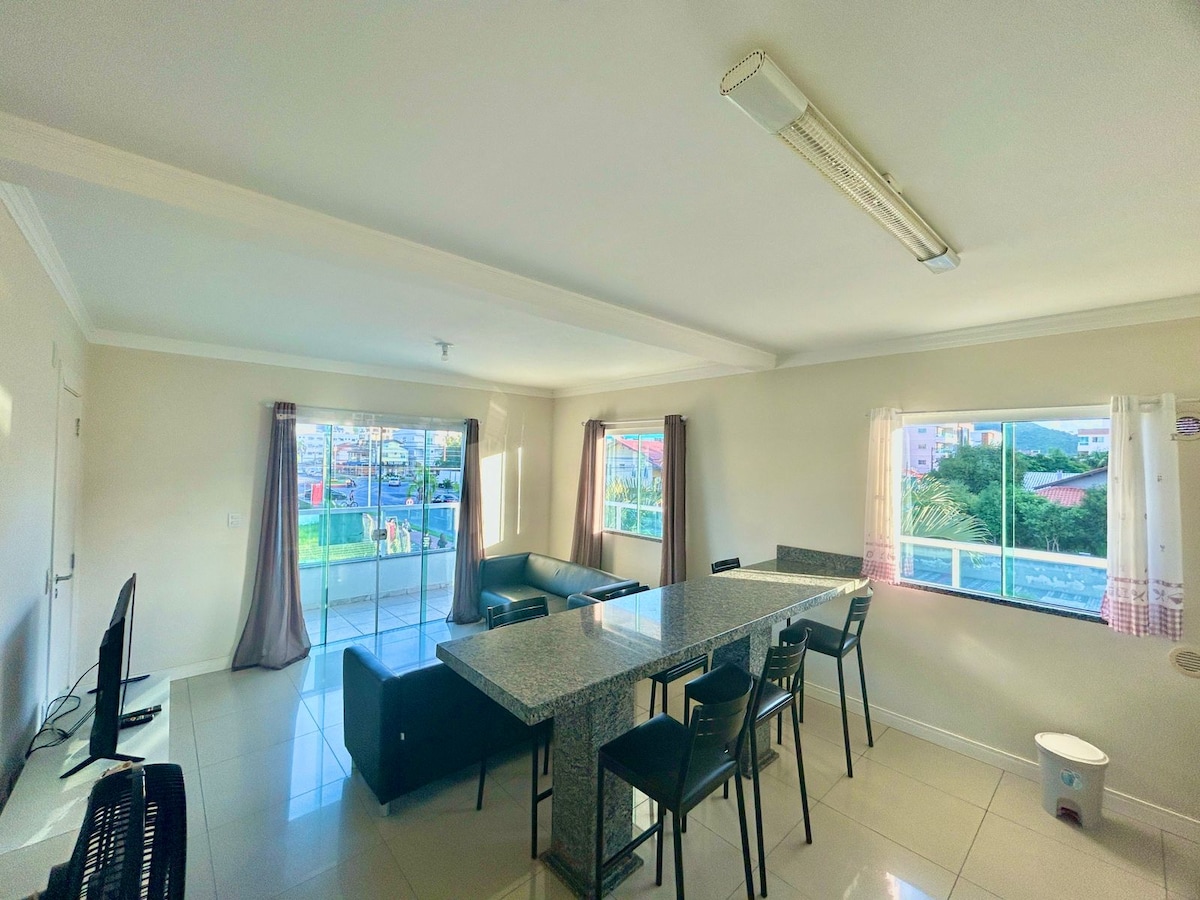 Beautiful full apartment, including living room, kitchen, bedroom, bathroom and a very spacious balcony. It is located right in the center of Bombinhas and 100 meters from the sea. At night, you can hear and sleep to the sound of the sea. Close to the main beaches of the region, all of which can be reached on foot, including trails... they are Sepultura, Retiro dos Padres, Mariscal, 4 Ilhas, Bombinhas, Bombas and Lagoinha, where there is a beach where you can see fish swimming and take diving lessons. The best experience you can have.