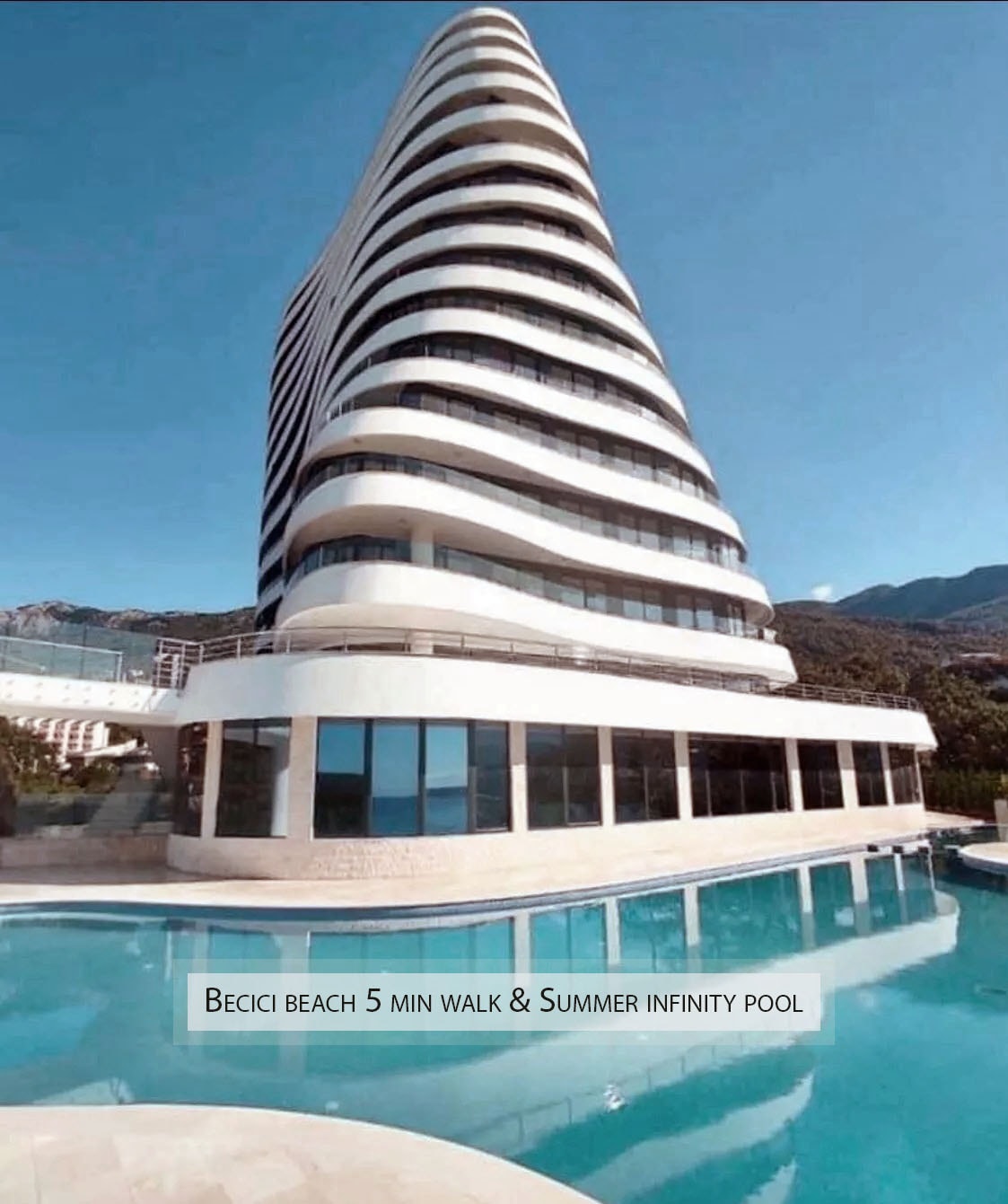 Discover the perfect blend of comfort and luxury with panoramic sea views and modern, sophisticated decor. Relax in lounge chairs by the infinity pool (heated during the winter) or walk just minutes to one of the best beaches in the area. ✔ balcony w/ sea view ✔ sun deck with umbrellas and loungers ✔ infinity pool with breathtaking views ✔ 5 min walk to the beach ✔ elevator ✔ covered parking (paid)