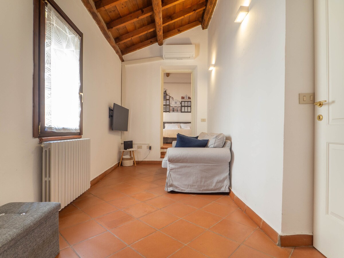 Enjoy a stay in this historic house in the heart of Ferrara’s former Jewish Ghetto with stunning views of the city's medieval skyline and a stone's throw from both the cathedral & fine Michelin dining. A top floor apartment, it features a very large master bedroom, a king size bed & a separate living room. It also includes a new smart tv, lounge area, fully equipped kitchen and a modern bathroom. The apartment is located on the third floor. Do note there is no lift. Bikes included!