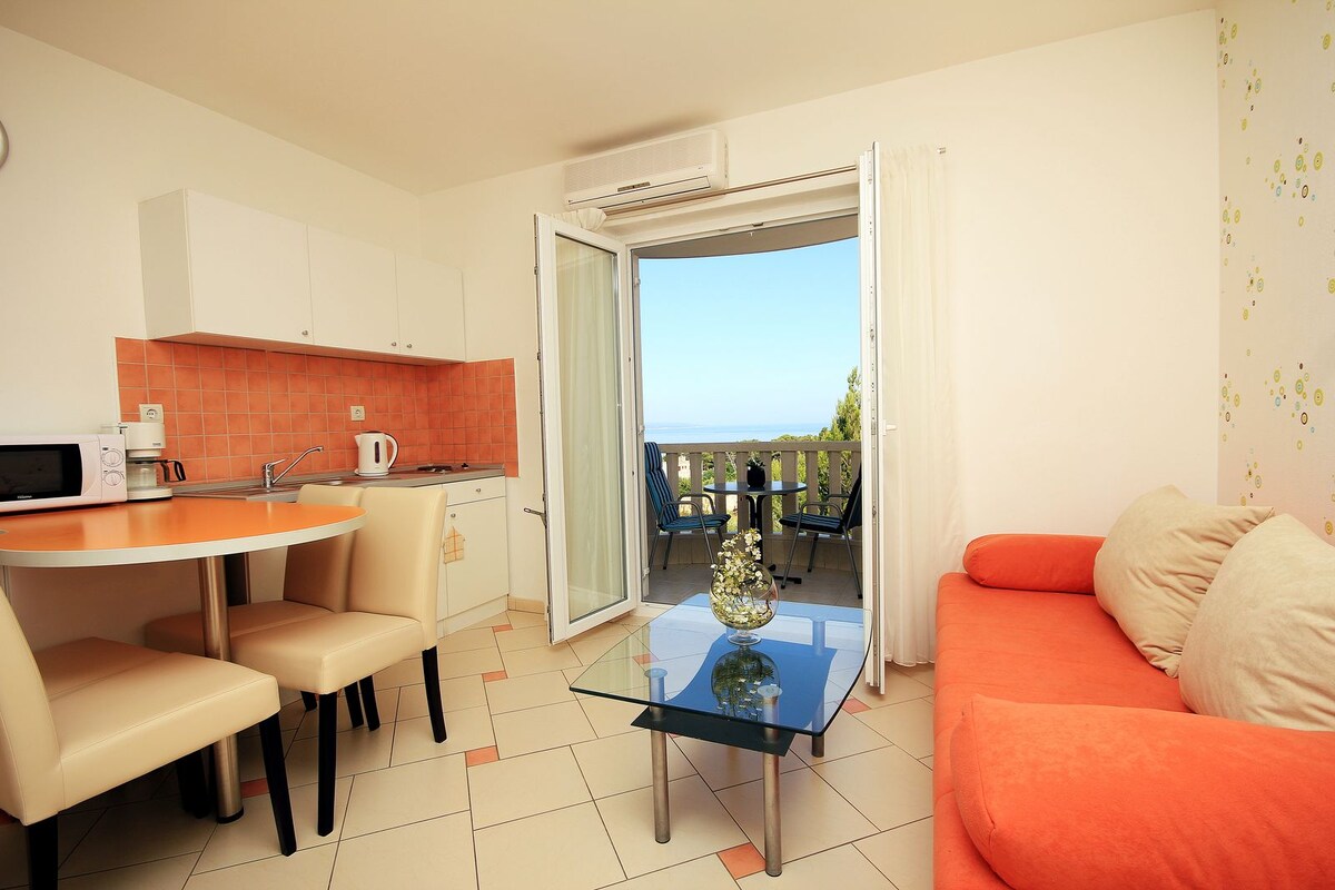This air-conditioned studio apartment is located South on the 1st. floor of the house, has everything you need for a pleasant and carefree stay. It consists of a small but fully equipped kitchen, dining table for two, bathroom, bed (160x200) and private balcony with sea view. Pet friendly, with necessarily announcement please.