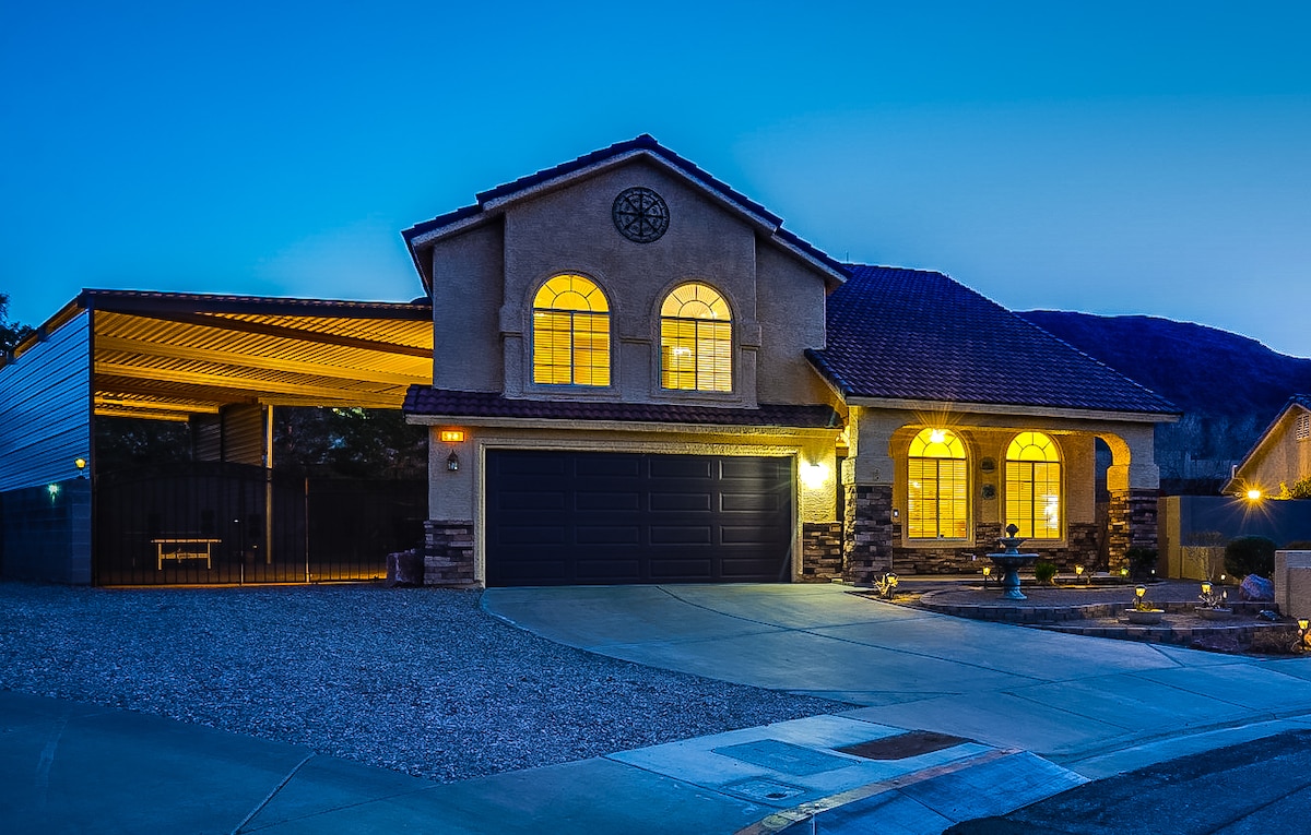 Immaculate 4 bedroom retreat sleeps 8 comfortably and can accommodate 10 with 2 small twin pullout futons (Reach out to Host with questions) Covered RV Parking available! This 2409 sq. ft. residence is loaded with upgrades and all the comforts of home. 15 mins from the strip and airport. Open and airy layout with tile floors, baths with custom tile and granite; large bedrooms with fans and Kitchen with stainless and granite.