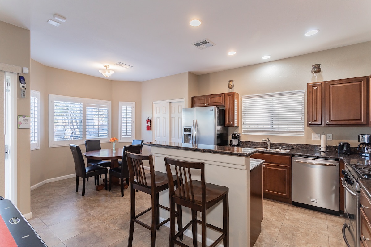 Looking for the perfect home to accommodate your group? Look no further; our sunny oasis awaits! Our spacious home, nestled in the Henderson neighborhood just outside Las Vegas, is the perfect group getaway. You can take a trip up to the Strip, or enjoy our sparkling swimming pool, multiple Smart TV's with major streaming sites, and BBQ in our private backyard. Surrounded by stunning golf clubs and restaurants, our beautiful three-bedroom home was intentionally designed for you!!