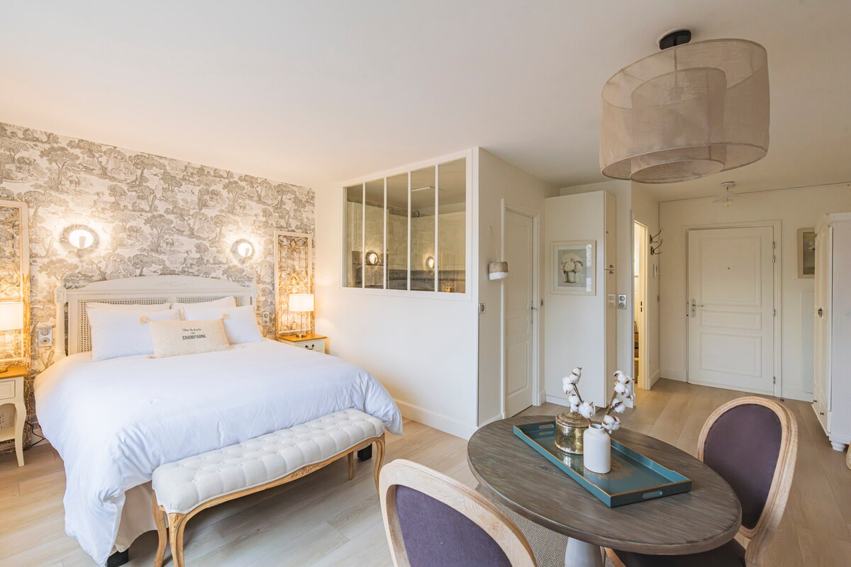 You will stay at Villa Rose. This residence, built in 1894 by the famous Eugène Mercier for his daughter Claire, is Florentine-inspired. This gives it its very unique character in the heart of Avenue de Champagne. The private mansion is surrounded by prestigious Champagne houses such as Moët & Chandon or Boizel. The Villa's park is a haven of greenery and calm. From the bedroom, the hillsides of the Champagne vineyard invite you to discover and taste.