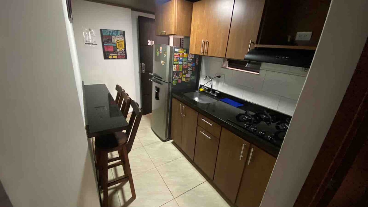Beautiful and cozy furnished apartment ideal for short and long stays. 2 bedrooms, 3 beds, 2 bathrooms, fully equipped kitchen. Television with cable service and Internet. Intercom, parking (optional). Sleeps up to 4 people. It is 7.5 km from El Dorado International Airport and 6.7 km from Salitre Transport Terminal.