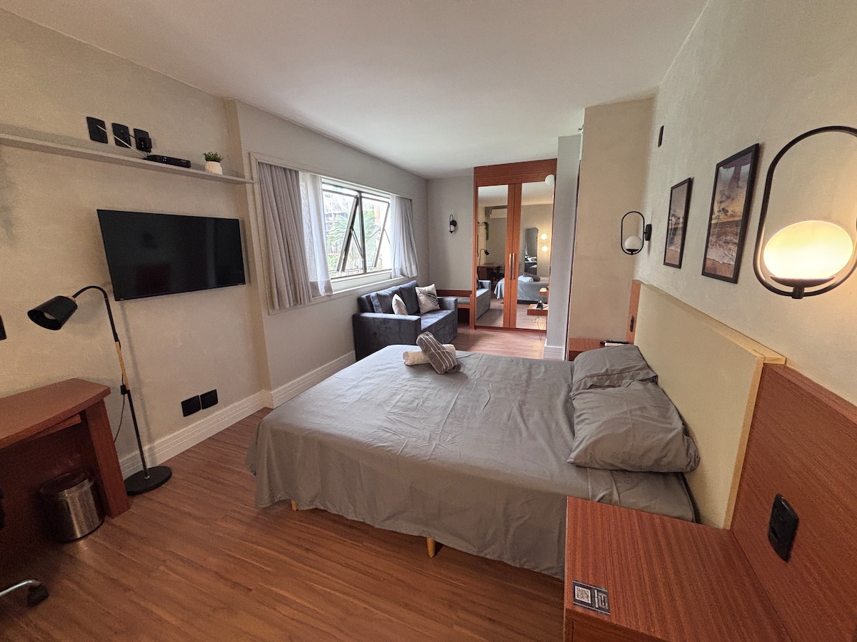 Comfortable space in the Northwest - prime area, close to Boulevard Shopping, supermarkets, bars, pharmacies, laundries and bakeries. With finely designed furniture in all environments, the space features televisions, air-conditioners, kitchen utilities, an oven, stove, refrigerator, microwave, sandwich maker, coffee maker, hairdryer, electric towel rack, work desk, double box bed and sanitized bed and bath linens. It includes private parking and a door with automatic lock.