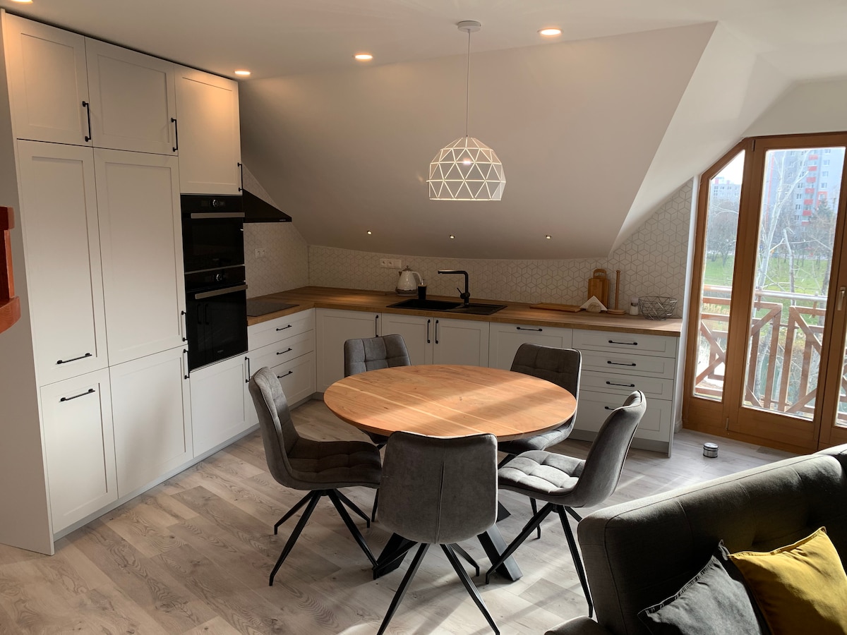 Forget your worries in this spacious and quiet place near the floodplain forest and the Danube River. The large living space above the garage next to the family house offers a nice view of the forest and a large garden with fruit trees. The accommodation is located near the X-bionic sports center, which you can reach by car within 7 minutes. The location offers plenty of cycling routes and water sports. The center of Bratislava is 20 minutes by car on the highway and in the nearby town of Šamorín you will find all the necessary shops and services.