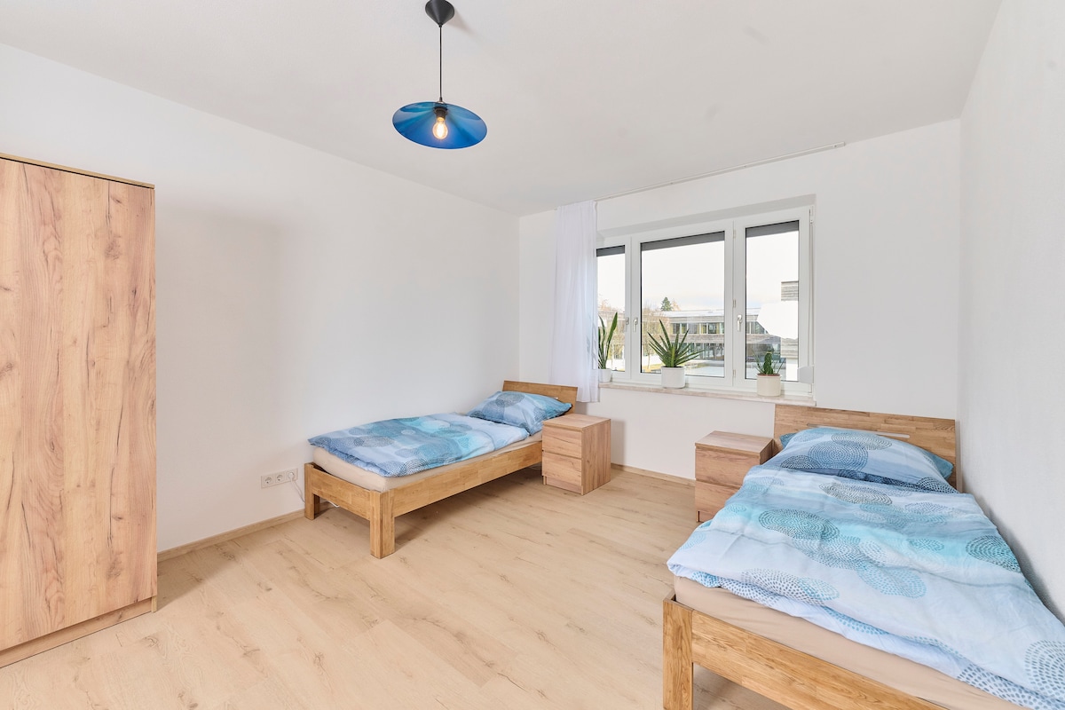 The sunny apartment is a light-flooded apartment and is divided into a living room with an open view to the south and west, a bedroom and bathroom with bathtub. It offers up to five people space for a pleasant stay. This is an apartment that has a very warm atmosphere. The balcony leads directly into the garden. A multi-generational park with a large children's playground is next to it. Car parking is in front of the house.