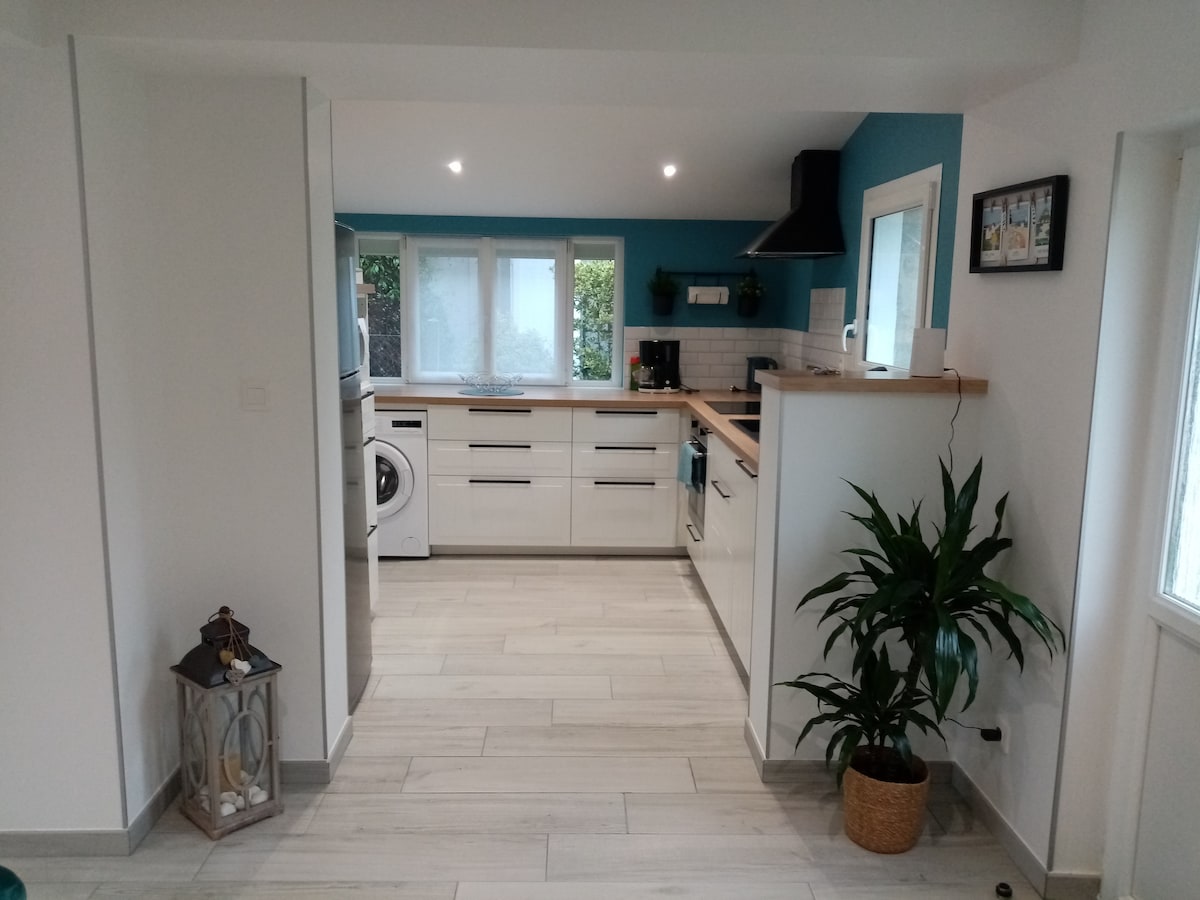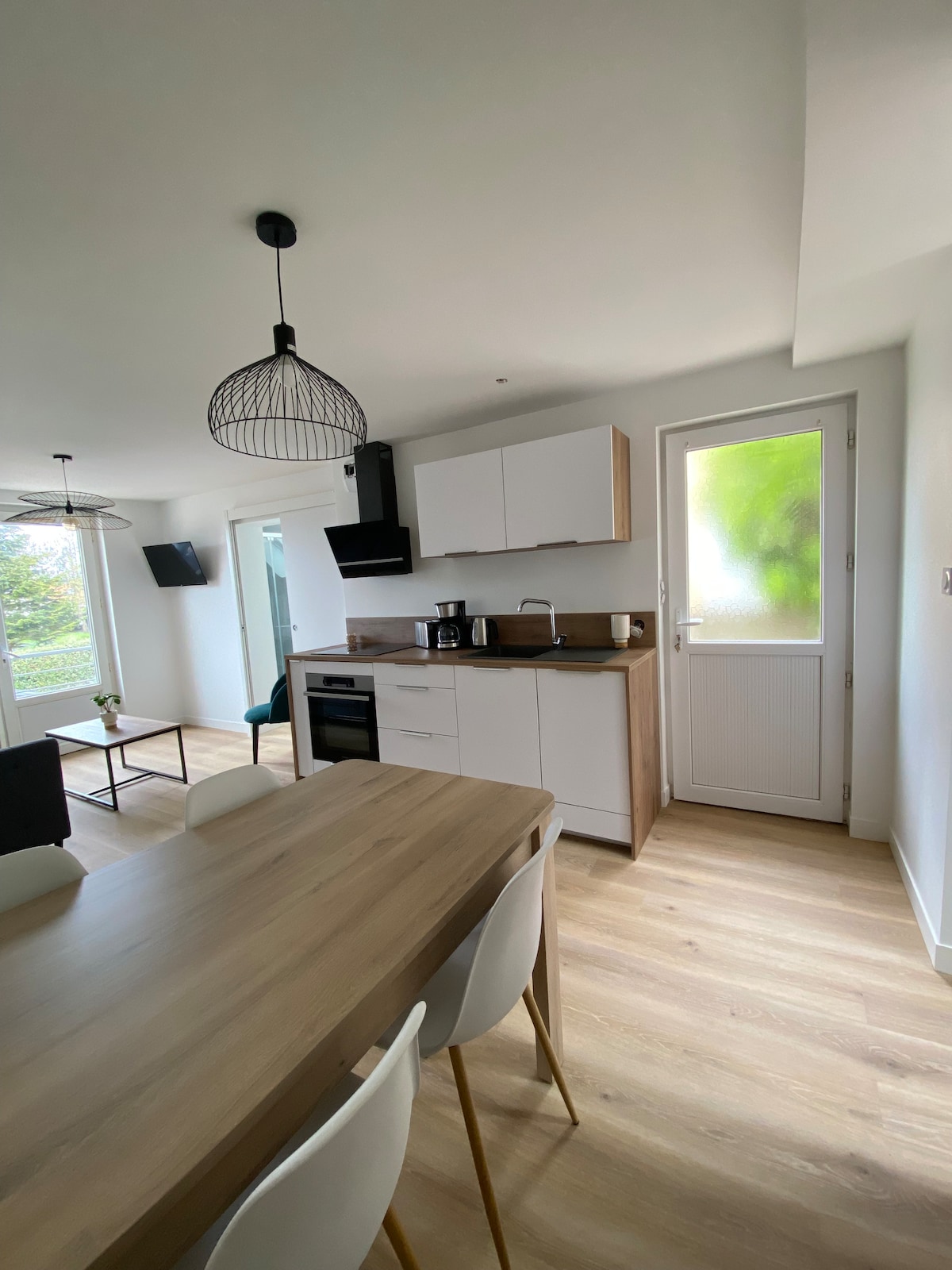 Enjoy a fully renovated home. Ideal for families or friends, located 3 km from the beaches of St Martin de Bréhal and 15 km from the seaside resort of Granville. Fully equipped, located on the 1st floor of a residence with elevator. The accommodation consists of a living room with lounge as well as a dining area, an equipped kitchen (induction stove, oven, microwave, fridge-freezer, dishwasher, coffee maker, kettle, toaster…)