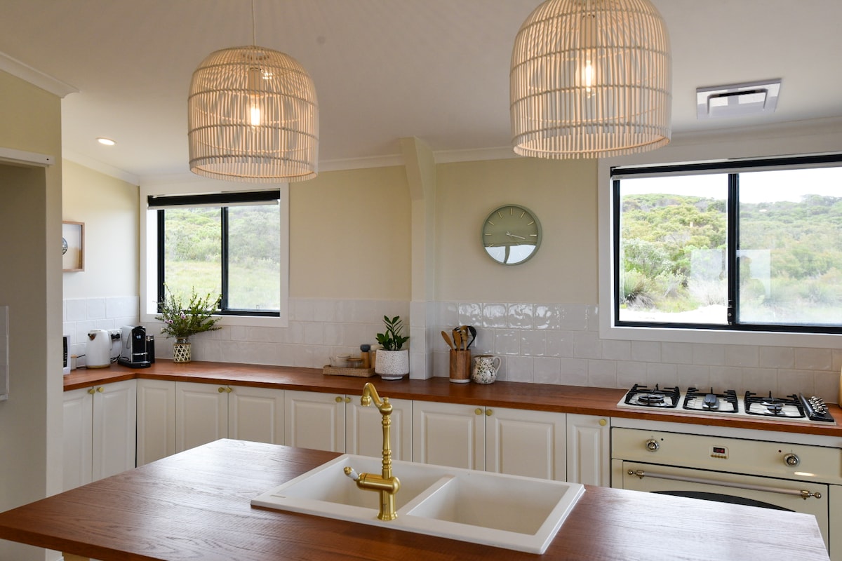 Our one-bedroom home is on a 5-acre property with stunning ocean views from the kitchen and living area. The separate bathroom pod, conveniently situated just across the deck, features a shower with panoramic ocean views and window looking out to the peaceful bush. A relaxing home for couples visiting Bremer Bay. Located on Point Henry Peninsula, our location offers easy access to Bremer's beautiful white sandy beaches, Fitzgerald National Park and unique Orca whale watching tours. EV friendly