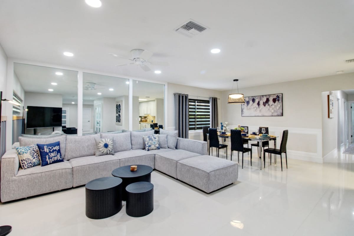 Discover the magic of Miami at our stunning 4BR/3BA modern retreat in vibrant Little Havana’s west side! This spacious, open-concept home sleeps up to 11 and features a sleek living room, fully stocked kitchen with stainless steel appliances, dinnerware, wine/shot glasses, cookware, tabletop appliances & complimentary coffee. The highlight? A resort-style backyard with a pool, mini golf, life-size chess, cornhole, Connect Four, outdoor pool table, a covered gazebo & deluxe grill/hibachi!