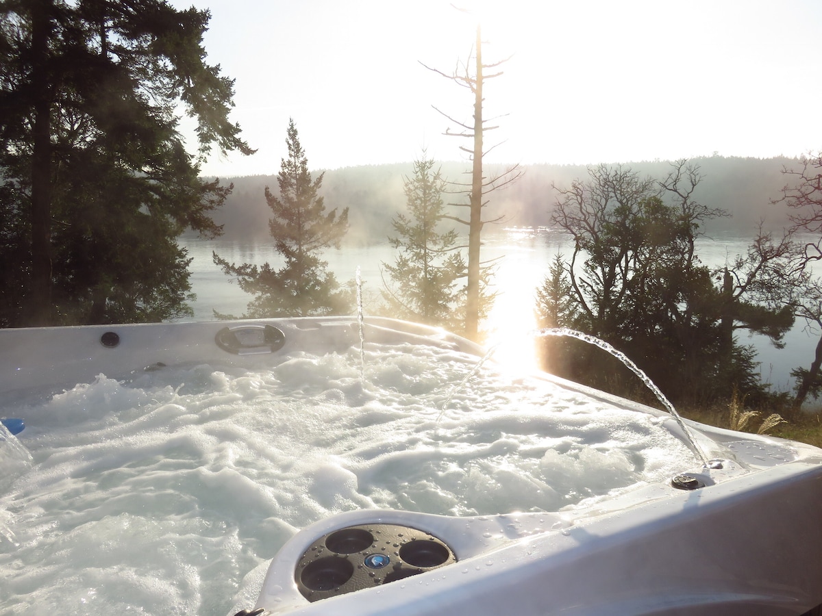 Located on Active Pass, the spectacular marine passage separating Galiano and Mayne islands, InTheBluff offers one of the most stunning outlooks in the Southern Gulf Islands. With 2 bedrooms, each with a queen bed, the log chalet accommodates up to 4. InTheBluff has an fabulous infinity-edge hot tub overlooking Active Pass.