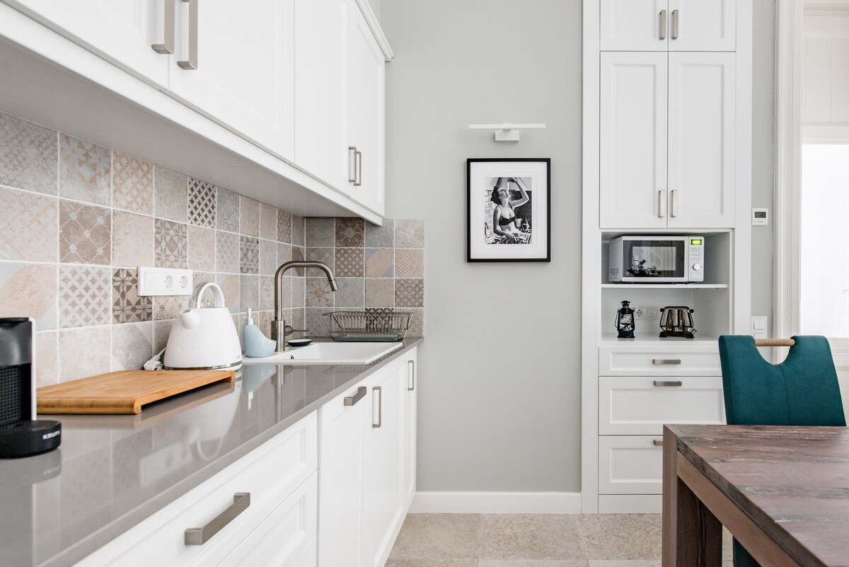 As another gem in our unique apartment collection, we present a brand new home away from home to the discerning Budapest visitor in an unbeatable location. It is stylish, luxurious, comfortable, and true to its environment and the architectural style of the building. It is one of the few genuine Bauhaus buildings in central Budapest, and while, of course, in a modernized way, we tried to stay true to many elements of this influential style when we created this unique apartment.
