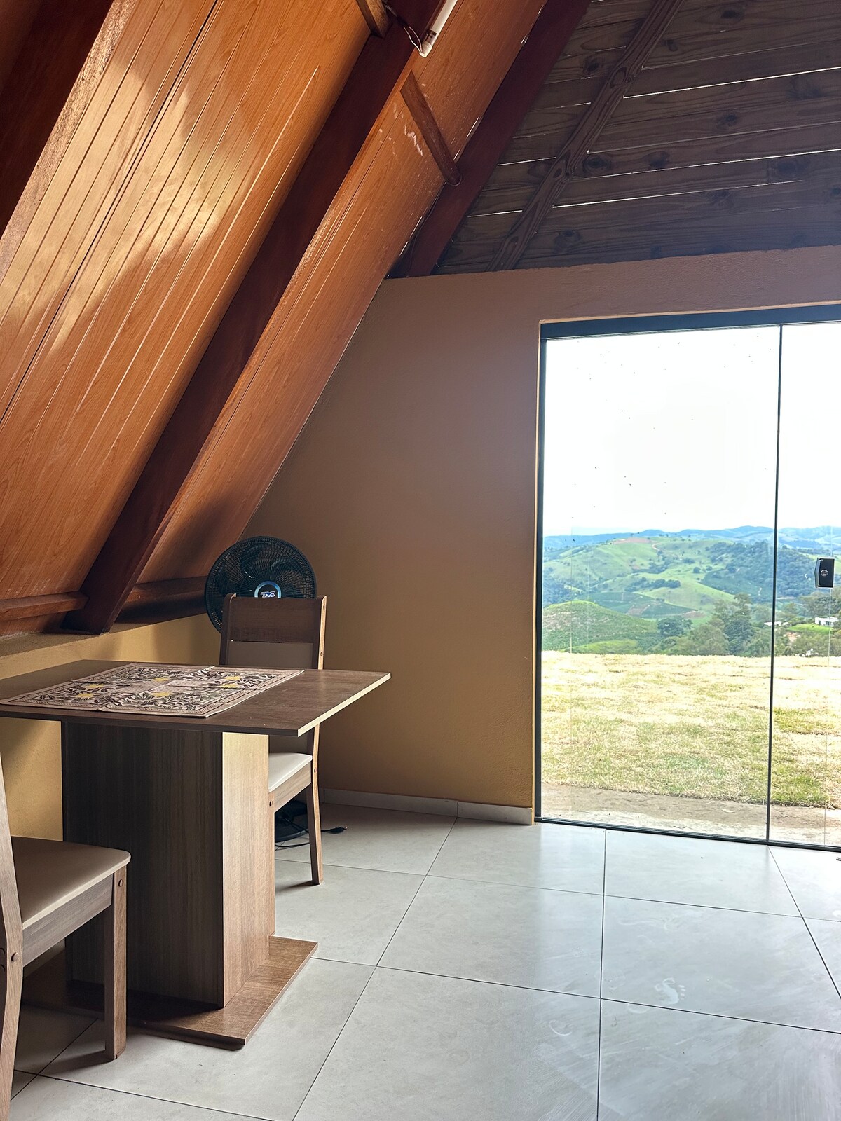 Refúgio romântico em meio à natureza, ideal para casais. Chalé estilo suíço (A-frame) em sítio cercado por cafezais, com rio e cachoeira particulares. Possui banheiras externas com vista para a Serra da Mantiqueira, jacuzzi interna, fogueira, churrasqueira, quadra de beach tênis, cama-balanço, sauna seca com vista e projetor interno com telão de 100”.