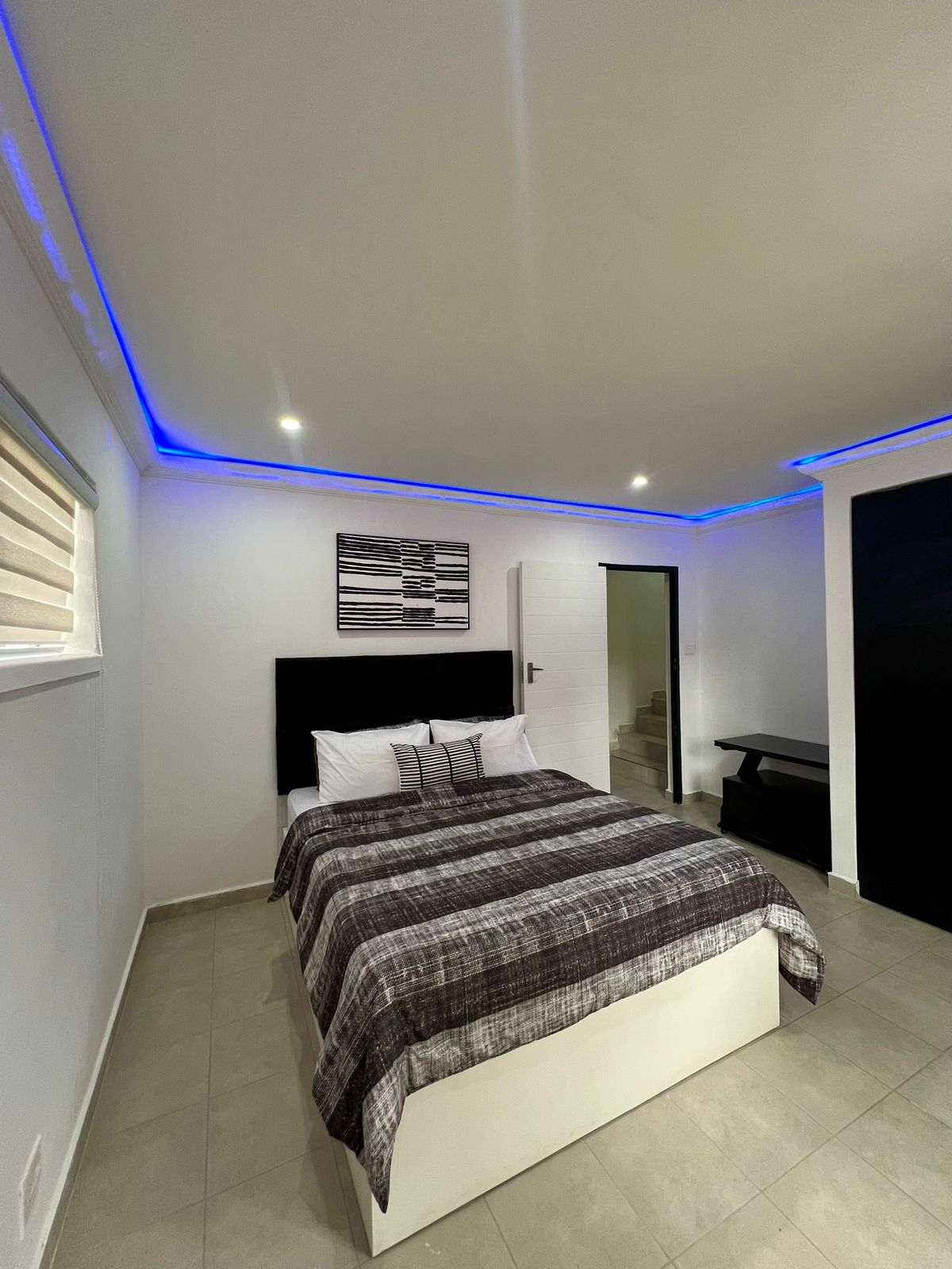 Three bedroomed house (MES) in a quiet neighborhood with a mid sized pool. Offers high speed uncapped wifi and two bedrooms are equipped with smart TVs with Netflix access. Comfortable work space for business travelers. Fully equipped kitchen, solar and generator back up- trampoline for kids, very ideal for families. Very secure with rapid response. Property manager available 24/7. Complimentary airport pick ups and special car hire rates for guests.