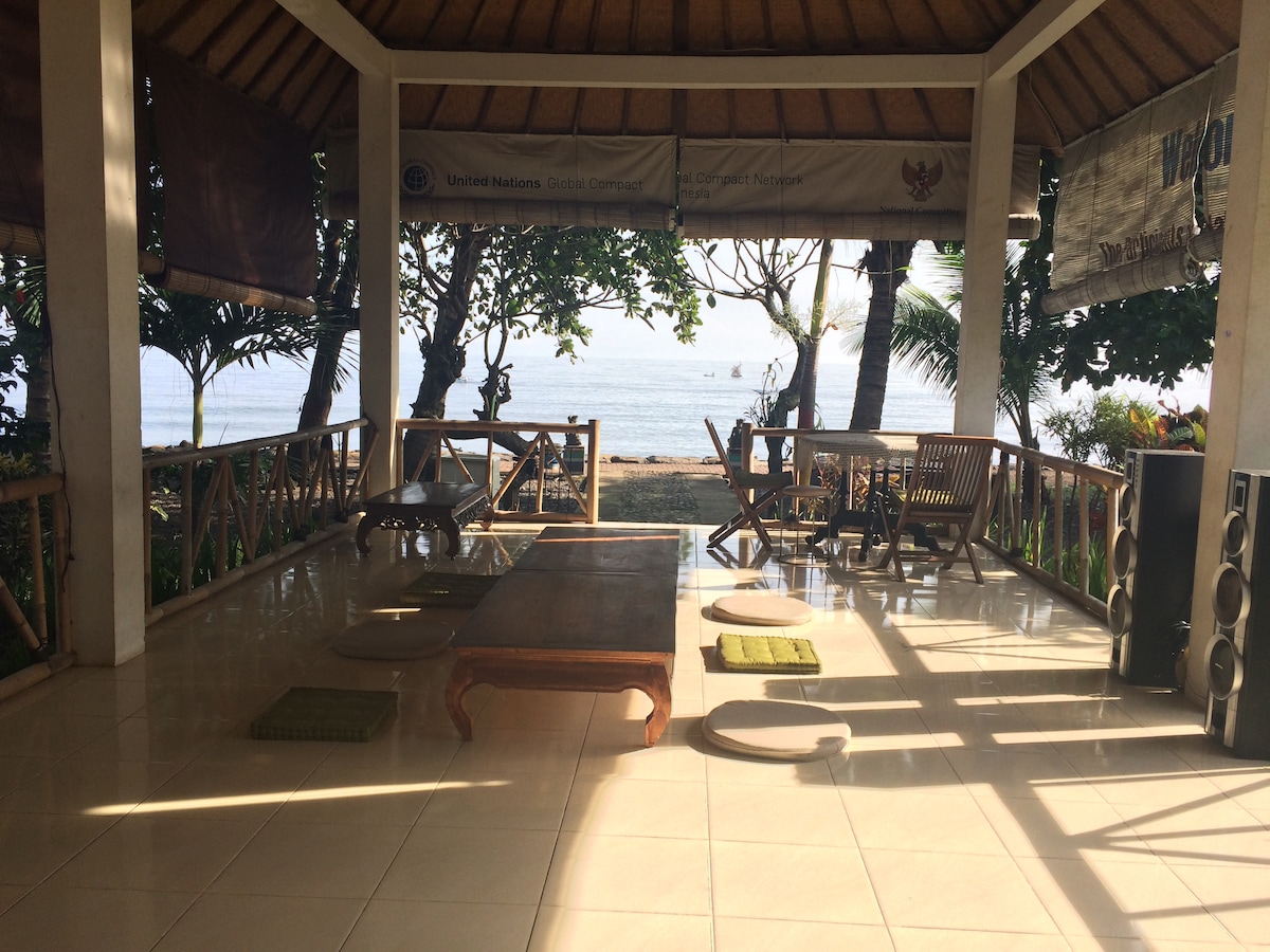 With Oceanview. Quiet, sunny location. The garden is full of flowers, butterflies and coconut palms, bordering the sea. Ideal for diving & snorkeling. The intact coral reef is right on our beach. Close to a Hindu Balinese fishing village. Small restaurant with delicious & inexpensive dishes, also for vegetarians & vegans. Free good wifi. Perfect to relax & experience traditional Bali, sunrises, dolphins, yoga & meditation & a great waterfall.