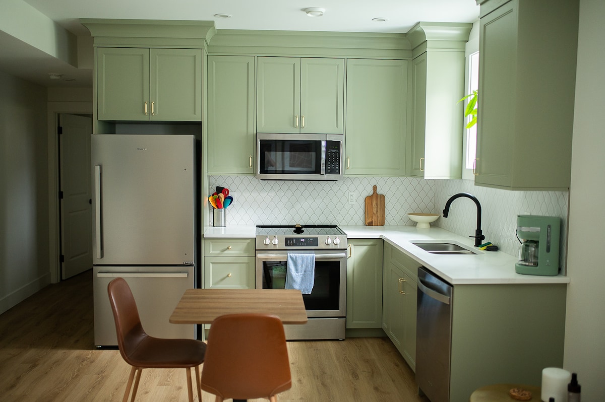 Welcome to our brand new basement suite, a quick 5-minute drive from downtown. Experience the comfort of an open-concept studio, featuring a fully equipped kitchen, Wi-Fi, and TV. Enjoy free laundry facilities, off-street parking for one vehicle, and a private entrance through the garage. Strict no-smoking, no-pets policy. Self-check-in with our keypad system provides you with flexibility and privacy. Owners on-site for assistance if needed. Kick back and relax in this calm, stylish space.