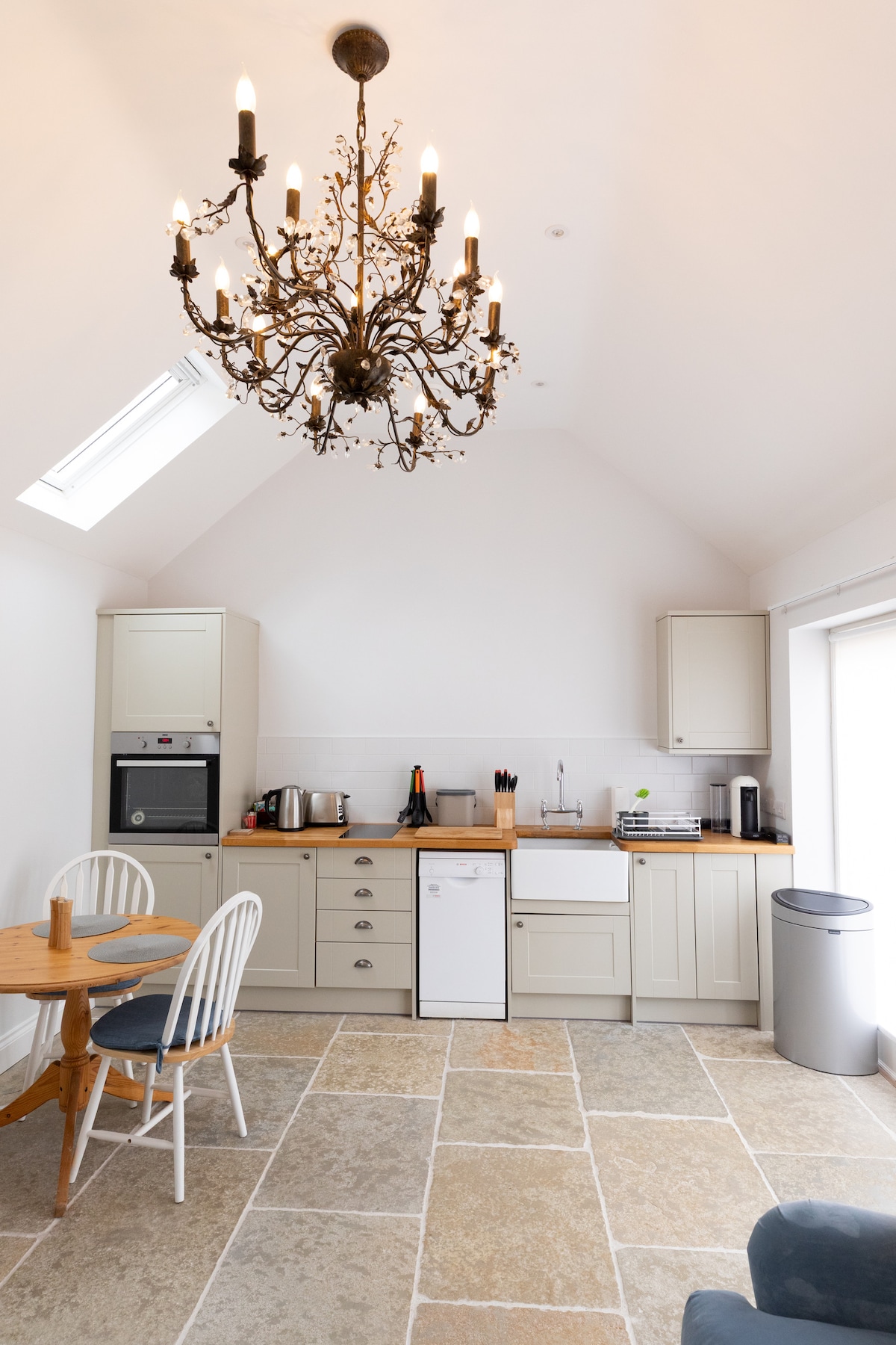Built in 1634, the Barn is on the edge of a village 5m from Market Harborough in Leicestershire. Converted in 2017, it's on our property but separate from it. Light and airy, it's one room/open plan downstairs, with areas for cooking, dining and relaxing. French doors lead out onto a pretty courtyard garden, with stone steps up to a raised area, where you can watch the sunset over the fields. Upstairs there's a well-equipped bedroom and bathroom with far reaching views over the countryside.