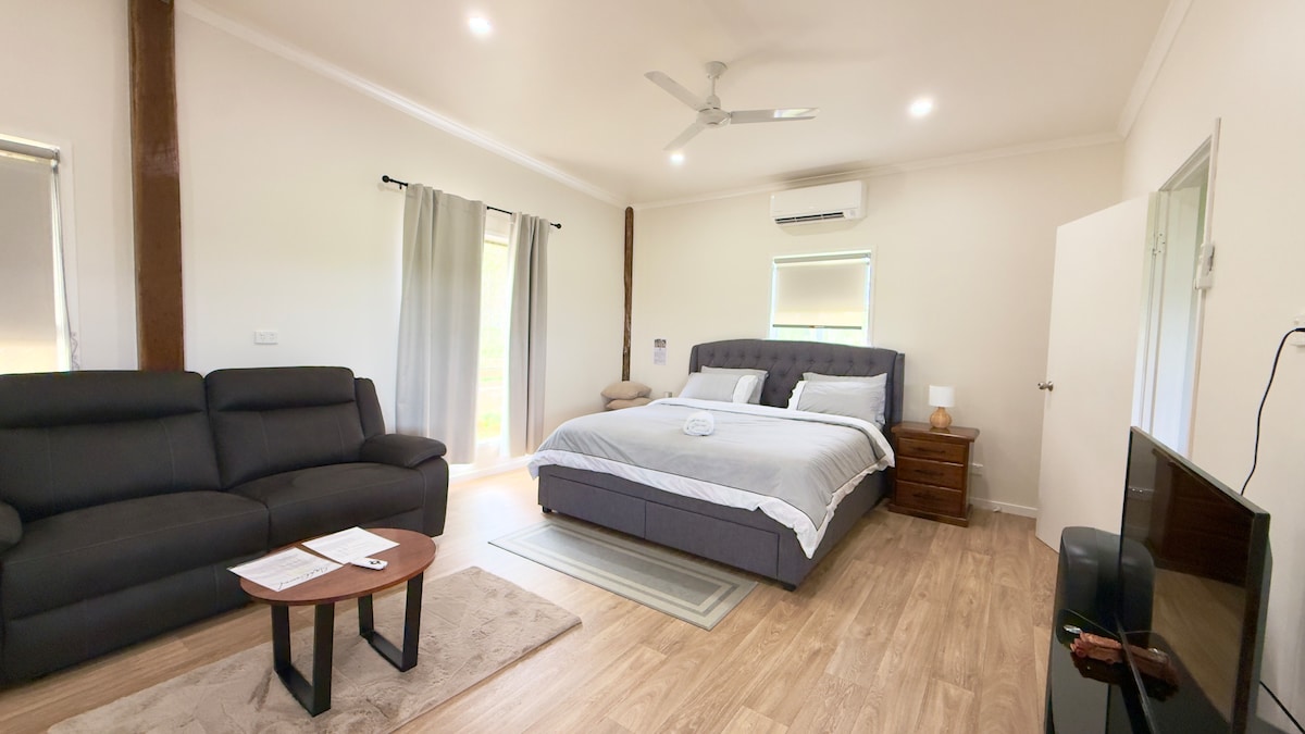 Spacious, light and modern accommodation, quiet rural location only 10 minutes from Bundaberg. 20 minutes from the beach. The Ground Floor is self contained with own kitchen, main bedroom with double bed, large sitting room with two single beds, TV with access to Netflix, wifi, books and board games. Harry and Philippa live on site, along with two dogs, two cats, one horse Jubilee, 5 sheep, chickens and a flock of guinea fowl that come and go.