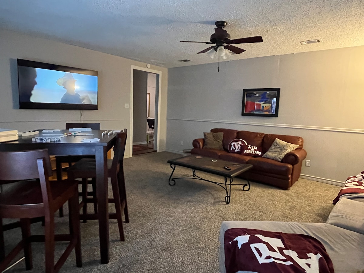 **Now offering long stay discounts for 4-7+ days Super convenient location to Kyle Field, Texas A&M sporting fields/arena, Santa’s Wonderland and nearby the Safari. Wood burning firepit and outdoor seating. "We will be back! We came in for an Aggie football game and it was the perfect house & location!" ---"Beautiful & spacious. Will come back and recommend to all our friends and family"--- "Great place for our large group that came into town for a sport tournament! – “Well-appointed and main