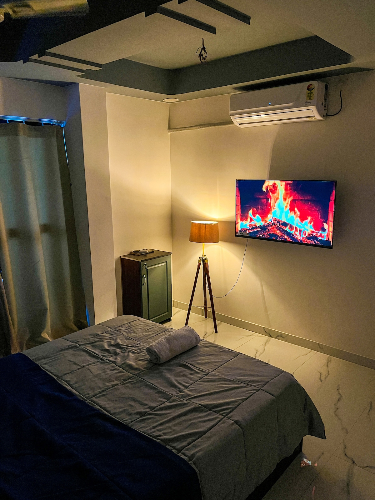 Relax with the whole family at this brand new apartment. Located only 5 km from the airport and surrounded by a scenic view from the balcony. The house is equipped with a TV, Refrigerator, water heater, water purifier and has a fully equipped kitchen for usage. It has a queen size bed and cupboard with locks for your valuables. Both local and outstation Guests are welcomed for their stay!!