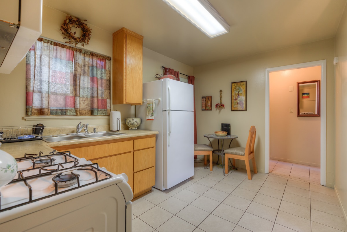 Experience comfort and convenience in our newly remodeled 2-bedroom guesthouse with King and Queen beds featuring memory foam toppers. Enjoy a fully equipped kitchen, spacious living room with a dedicated workspace, ensuite washer/dryer, and a furnished outdoor patio with a BBQ. Located downtown, it offers easy access to Chico's best dining, shopping, and entertainment, as well as proximity to Bidwell Park and Chico State University. Ideal for both business and leisure travelers.