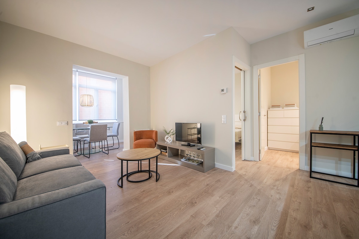 Stylish one-bedroom, one-bathroom apartment in the very central Sant Antoni area, ideal for up to four people. The bedroom has a double bed and there is a double sofa-bed in the living room that can sleep an extra two more people. It combines parquet floors & modern decor and is full of natural light. The apartment has a dining room with a large table, located near the kitchen.