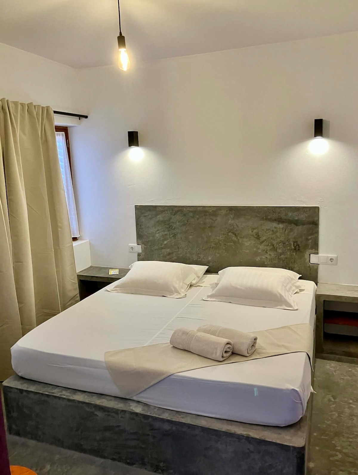 Bedroom with entrance from the outside including a double bed, bathroom with toilet, balcony on the south side and small terrace on the north side. The entrance is on the right in front of the entrance of the house by the spiral staircase. Good for young people. Breakfast is included but everyone will prepare it themselves, continental type, bread, juice, milk, coffee, tea, butter, jam, cheese. Guests have access to the kitchen and both terraces of the house and the barbecue.
