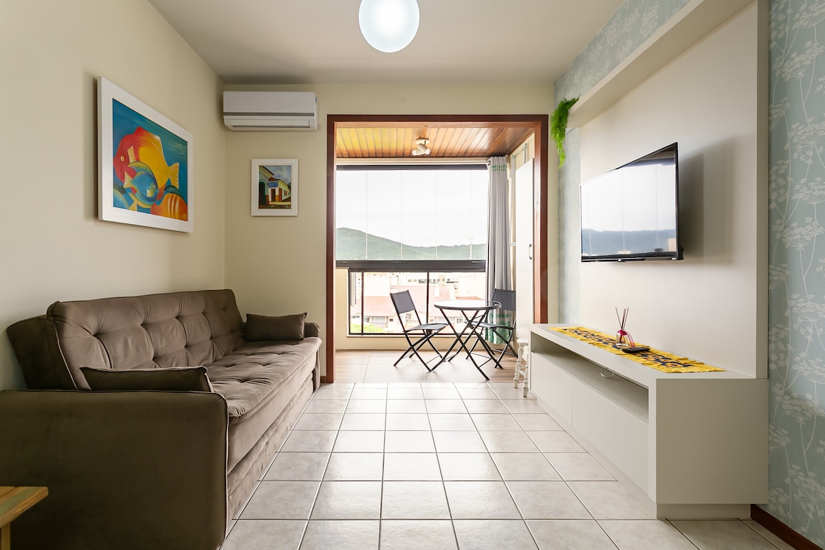 ***Entire apartment ***Covered private parking space in the building Internet-cable TV. Airy room, air-conditioning, fan, balcony, full kitchen with cooktop, refrigerator, coffee maker, electric oven, microwave, washer and dryer, complete kitchen utensils. On the sea block, 150 meters, a popular beach, sandy area, close to Canasvieiras, Ponta das Canas and Praia Brava beaches, a safe and quiet place. Well located, close to everything. Close to Sapiens Park.