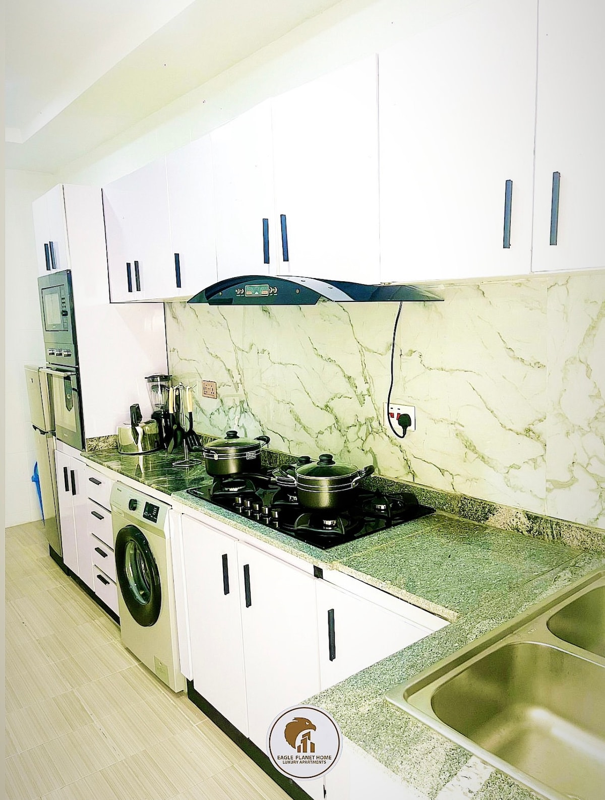 Experience luxury living at its finest with this 1 bedroom apartment offering a well finished space perfect for entertaining guests. The spacious living area features a tasteful finished furnishing while the kitchen is well equipped with basic kitchen amenities. The bedroom offers a peaceful oasis with a queen size bed. Equipped with a double balcony located at the front and behind. Enjoy the convenience of a laundromat alongside the building’s amenities. This is urban living!