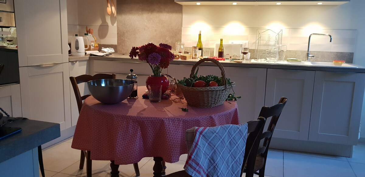 The apartment is fully renovated and comfortable, it is located on the ground floor of a village house with private access. Located in the center of the village on a quiet street with many free parking spaces nearby. Shops and restaurants are within walking distance. It can accommodate 4 people plus a baby (baby bed, high chair, changing table available). The kitchen is fully equipped, bathroom with a separate toilet, laundry room...